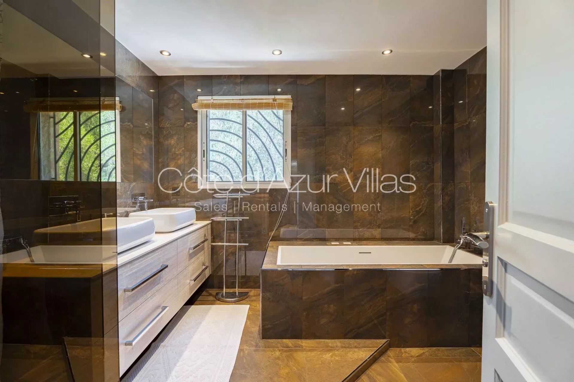- un coin nuit avec porte séparée, menant à deux chambres; l'une avec un lit double 140*200 et l'autre avec un lit double 160*200. Cet espace offre également une grande salle de bain avec deux vasques, une douche et une baignoire