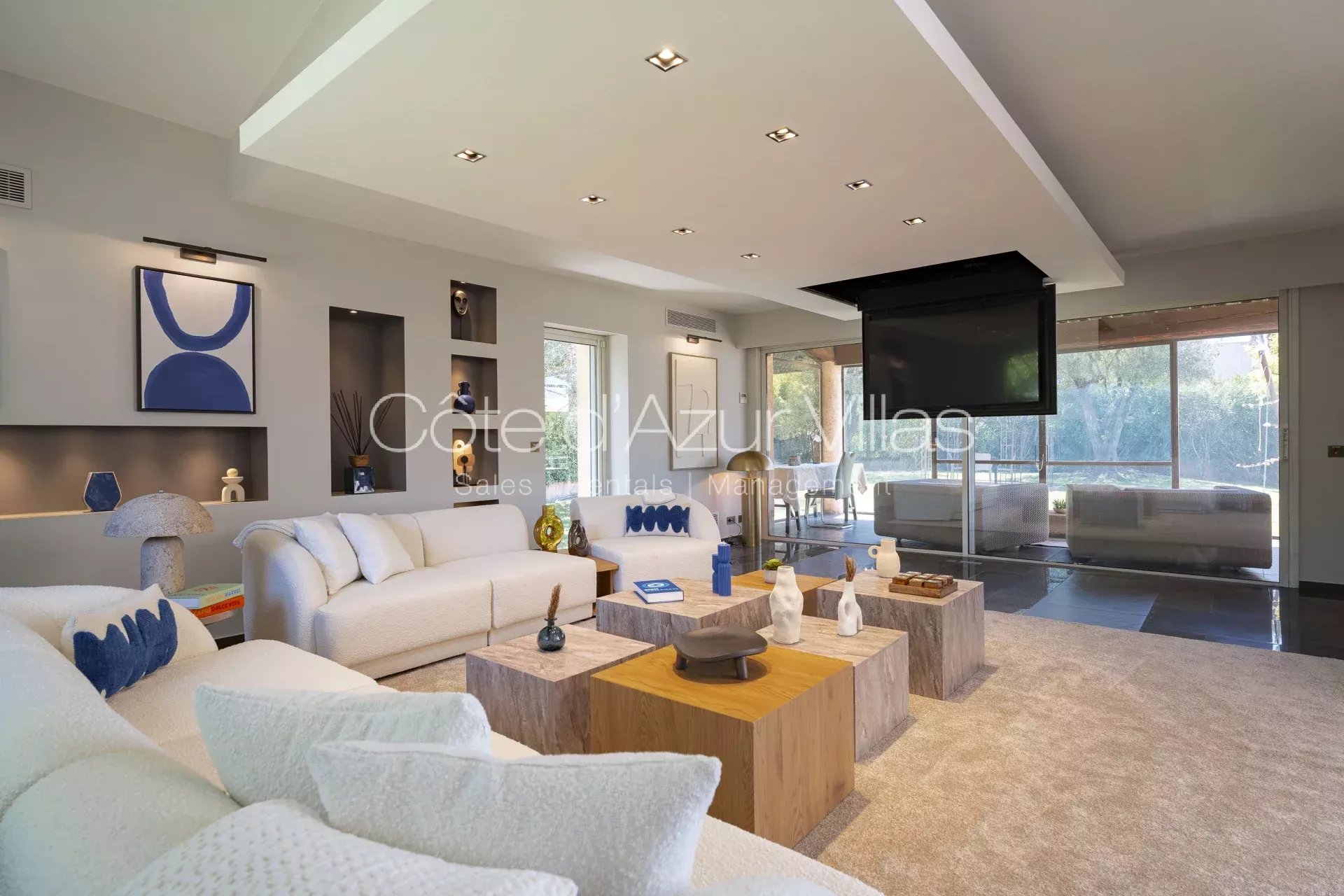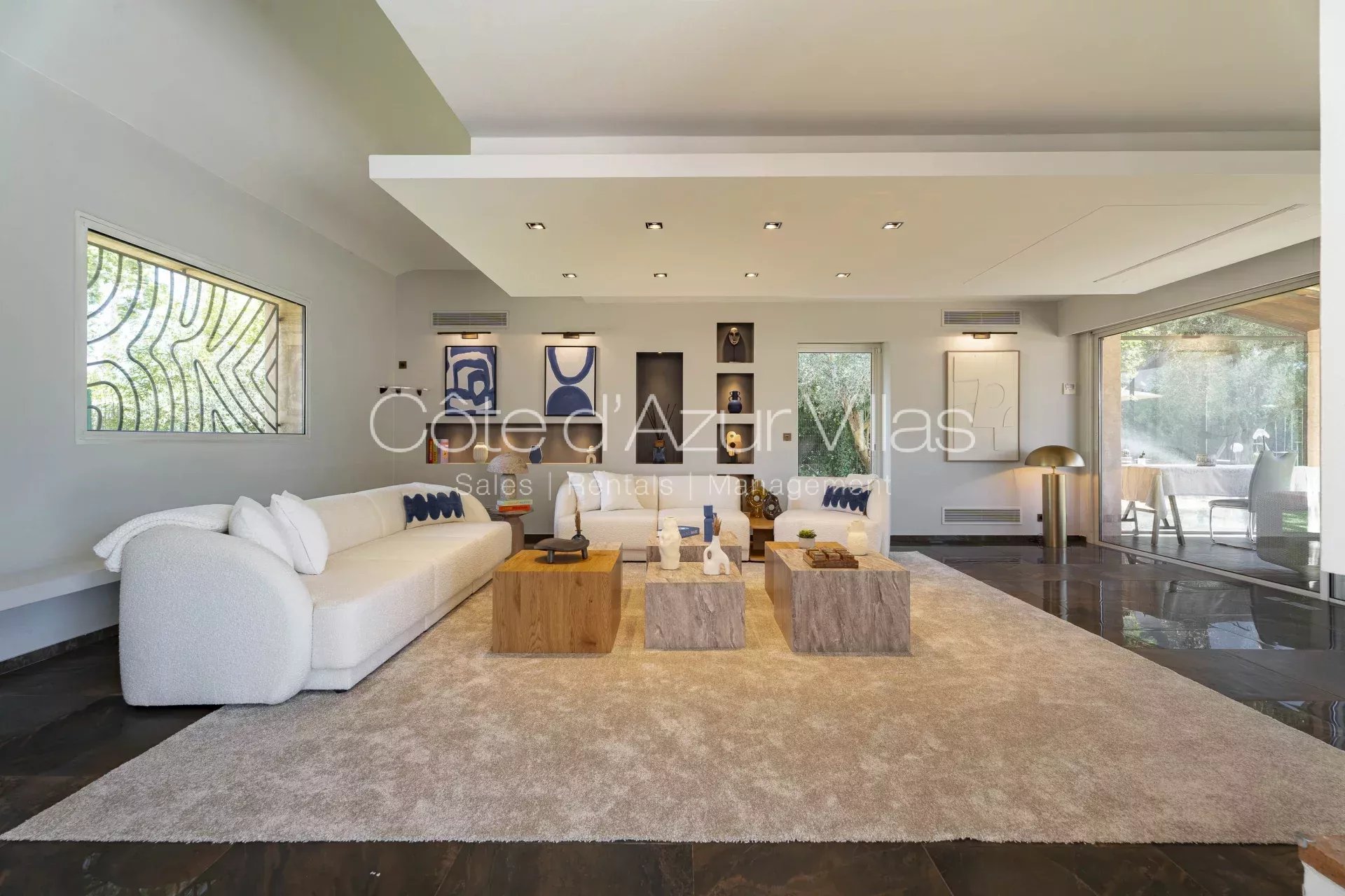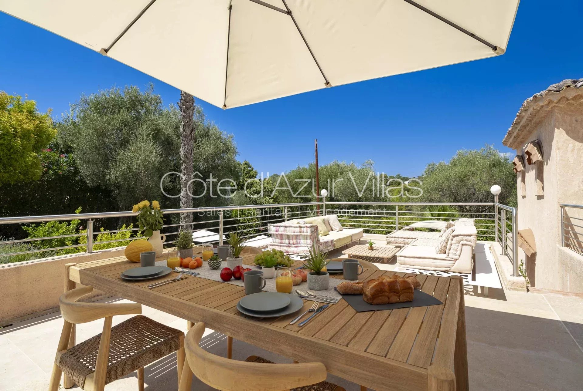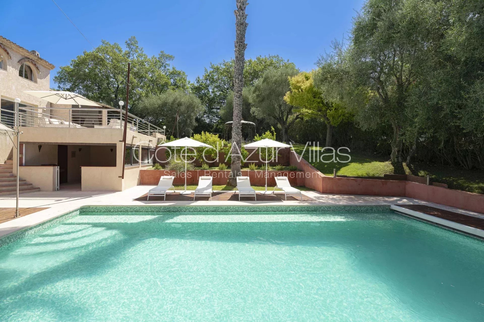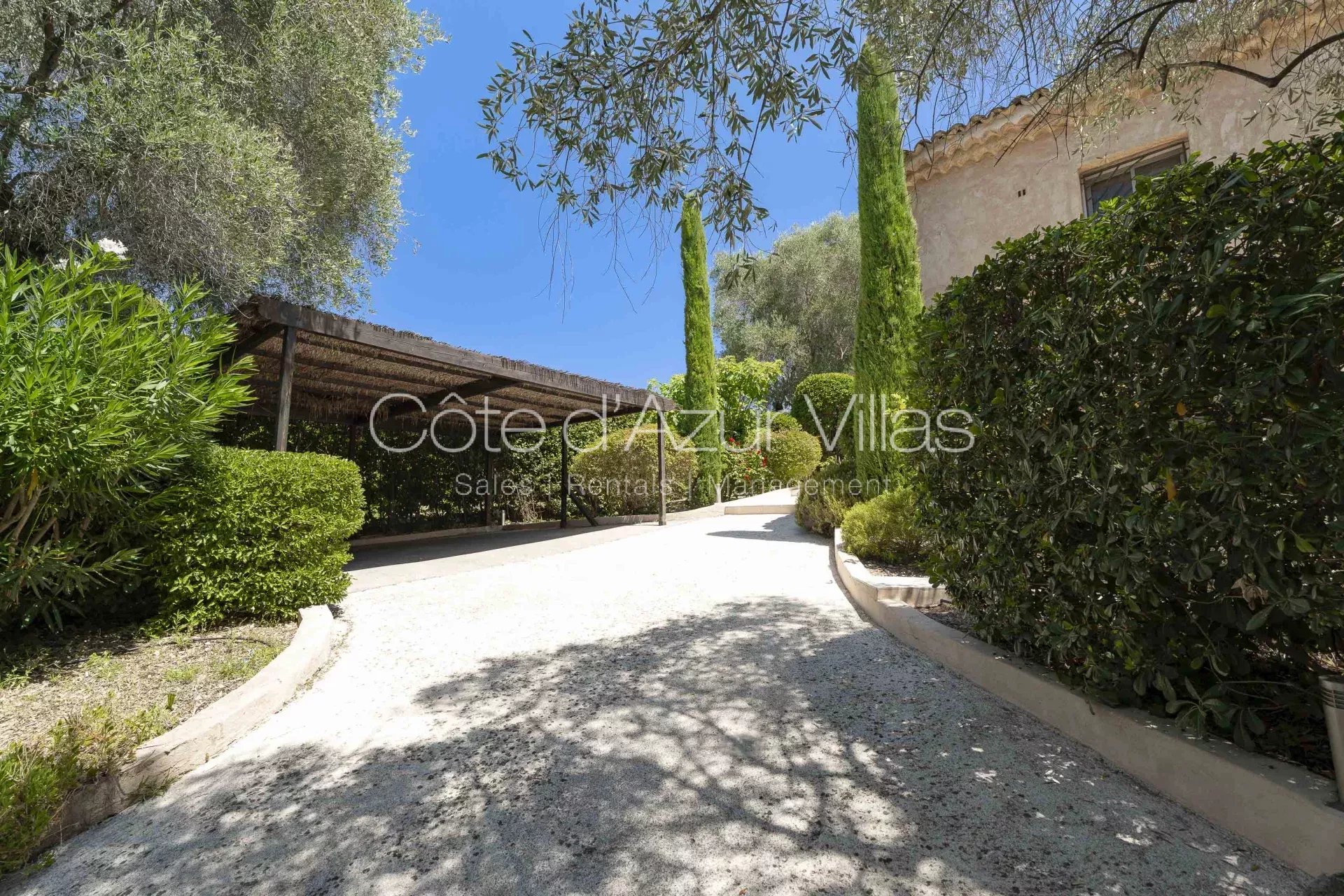 La villa offre de magnifiques espaces de vie intérieurs et extérieurs sur une grande propriété avec des oliviers centenaires, deux abris de voiture et un portail de sécurité électrique.