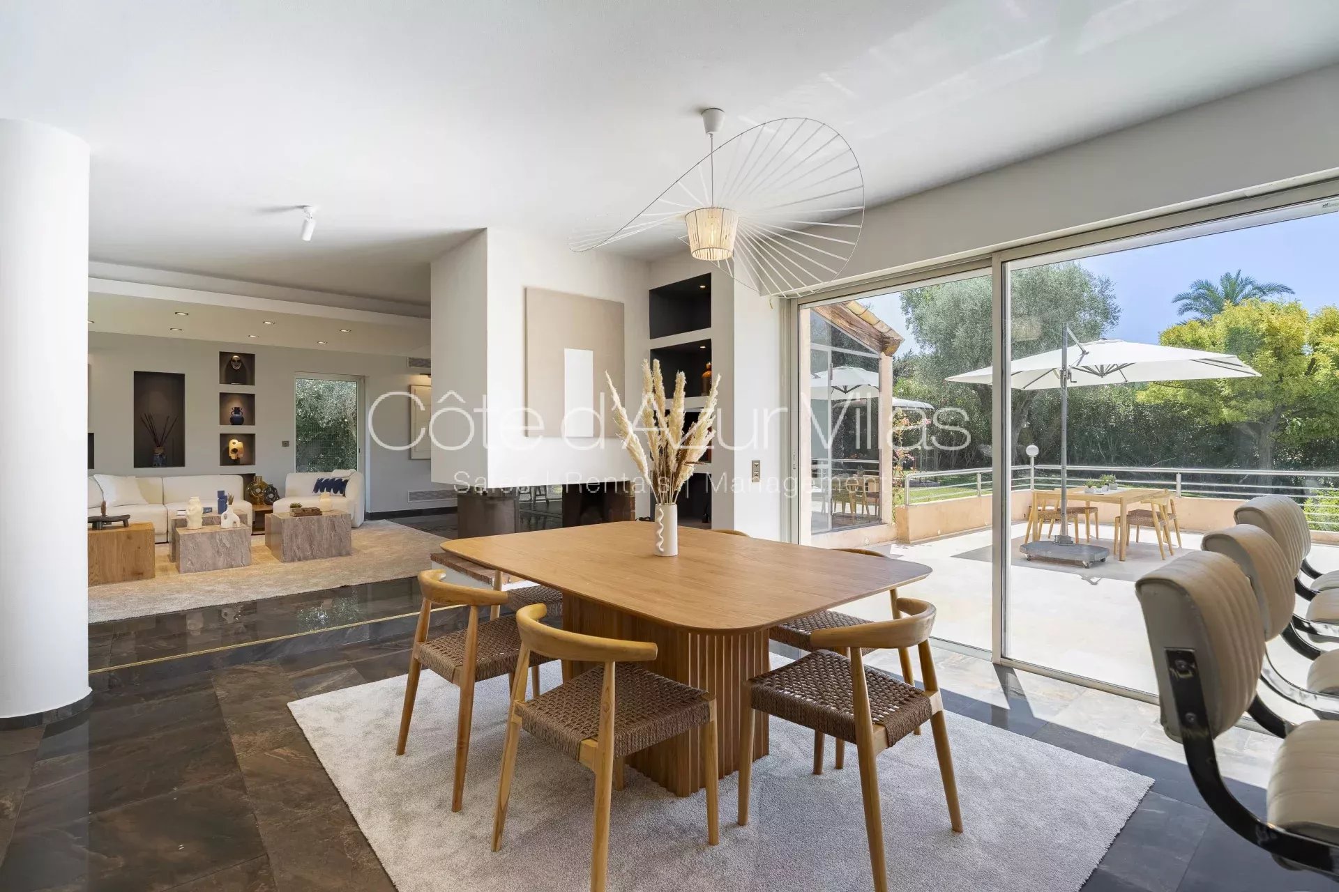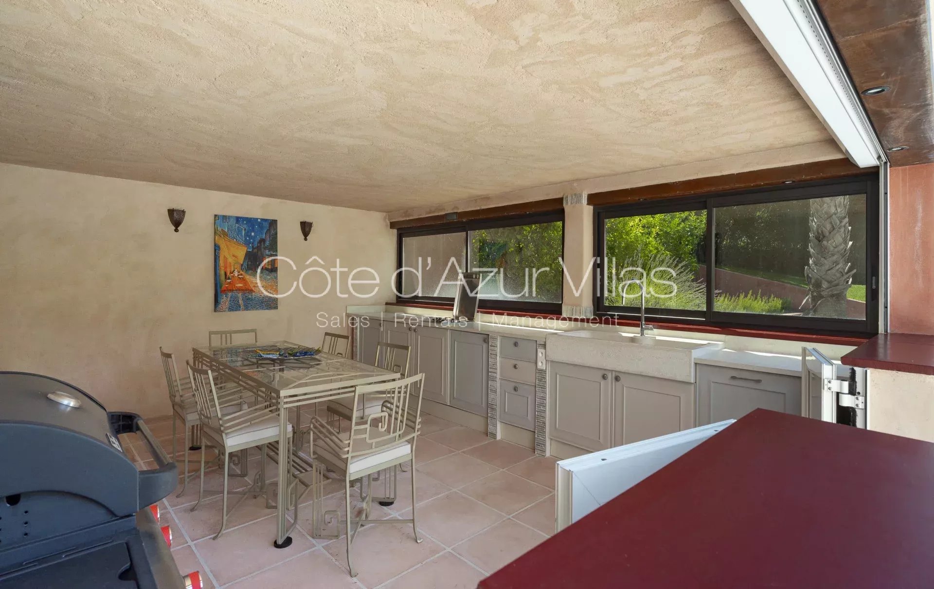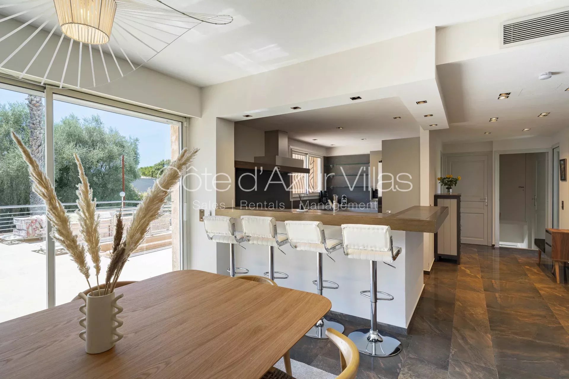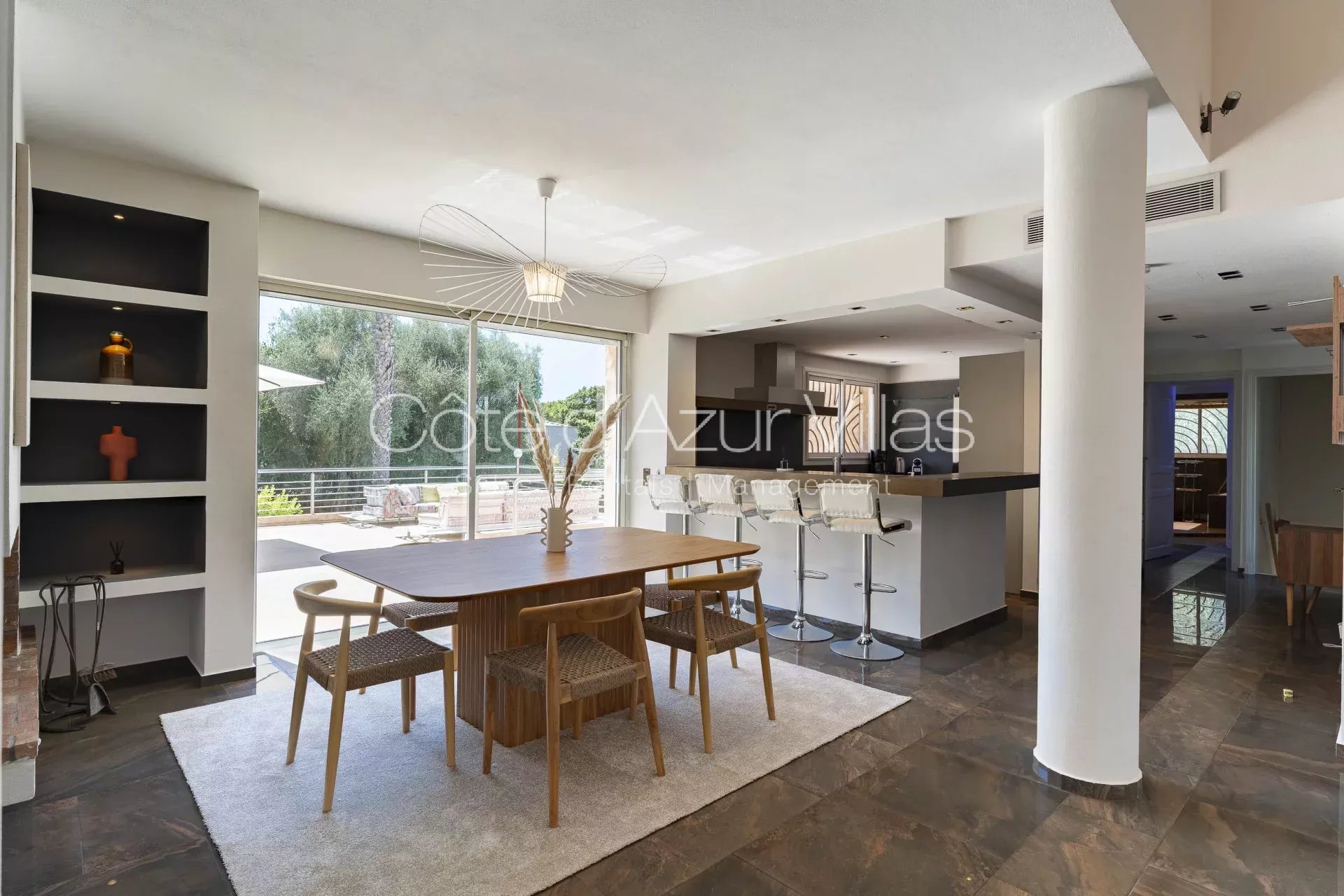 - une belle cuisine ouverte sur la salle à manger, donnant sur une grande terrasse extérieure couverte