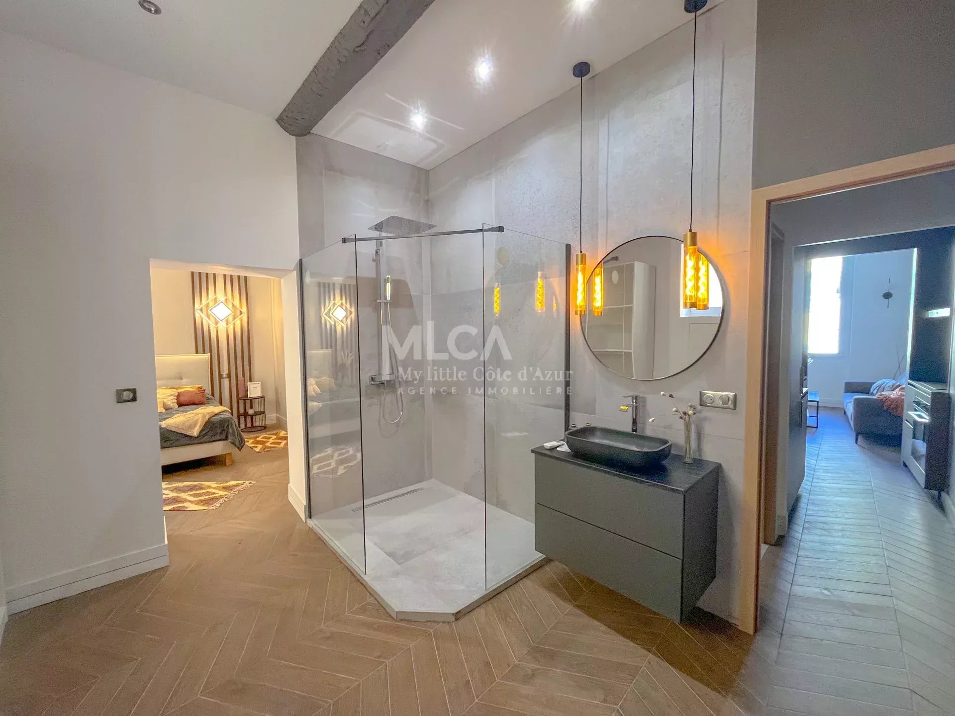 A vendre appartement dans le vieil Antibes, magnifique 3 pièces entièrement rénové avec gout, terrasse commune sur le toit. L'appartement est composé : d'un salon, d'une cuisine semi ouverte, d'une chambre de maitre avec salle de douche et dressing, d'une chambre, d'une salle de douche avec WC. Toit terrasse commun avec vue sur la mairie et le marché provençal permettant de déjeuner au soleil ou de prendre un apéritif en fin de journée.