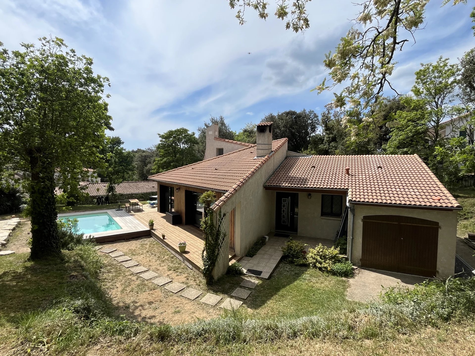 Sur un terrain de 2 000 m² environ, cette magnifique maison d'architecte, d'une superficie de 124 m², comprenant une entrée, une pièce de vie avec cuisine équipée et donnant sur une grande terrasse et la piscine, 3 chambres, 2 salles d'eau, toilettes indépendantes et à l'étage, une mezzanine et un bureau. Un garage complète l'ensemble.