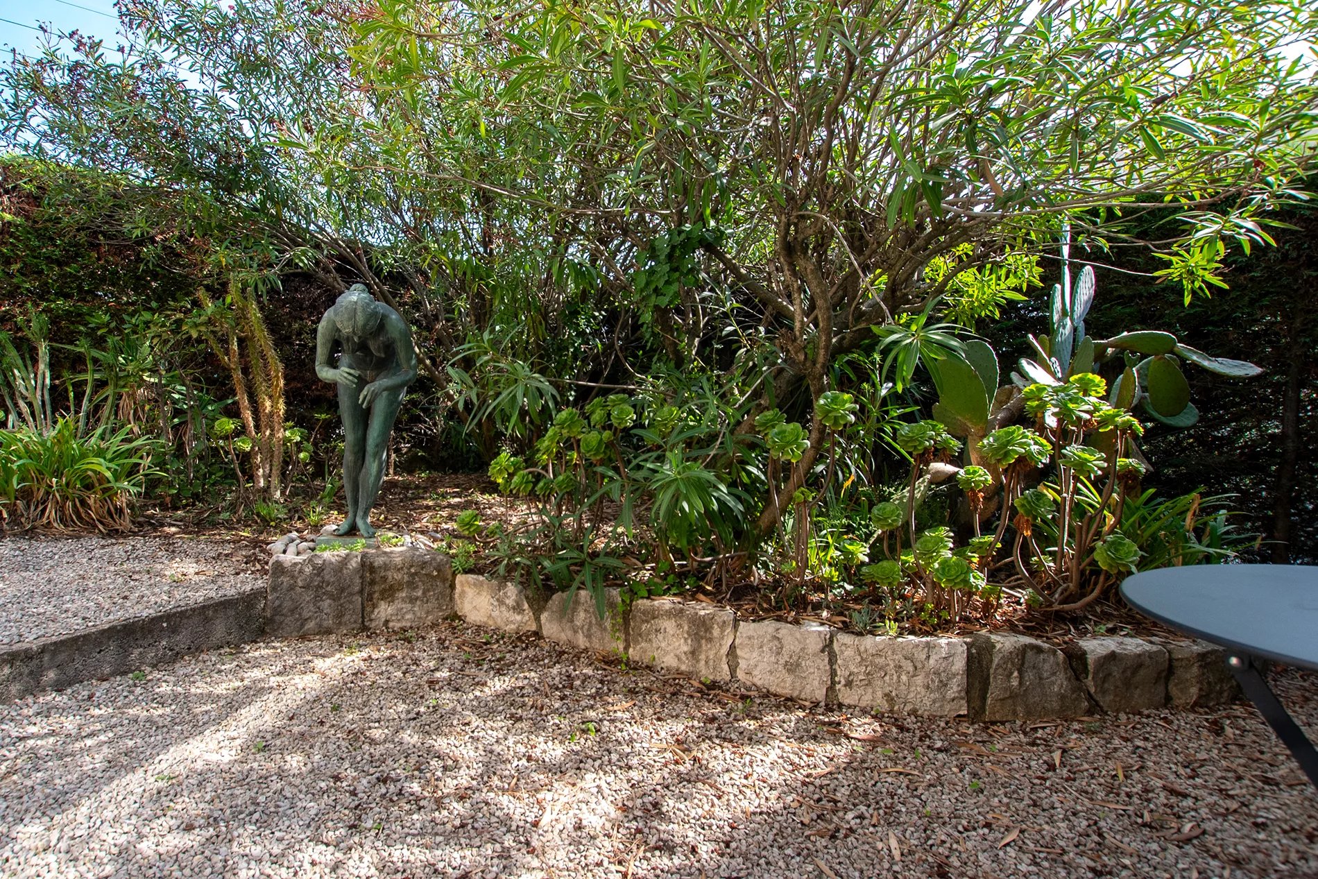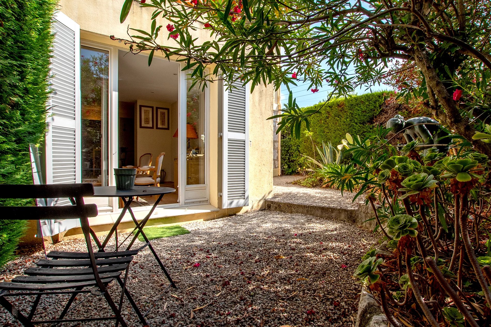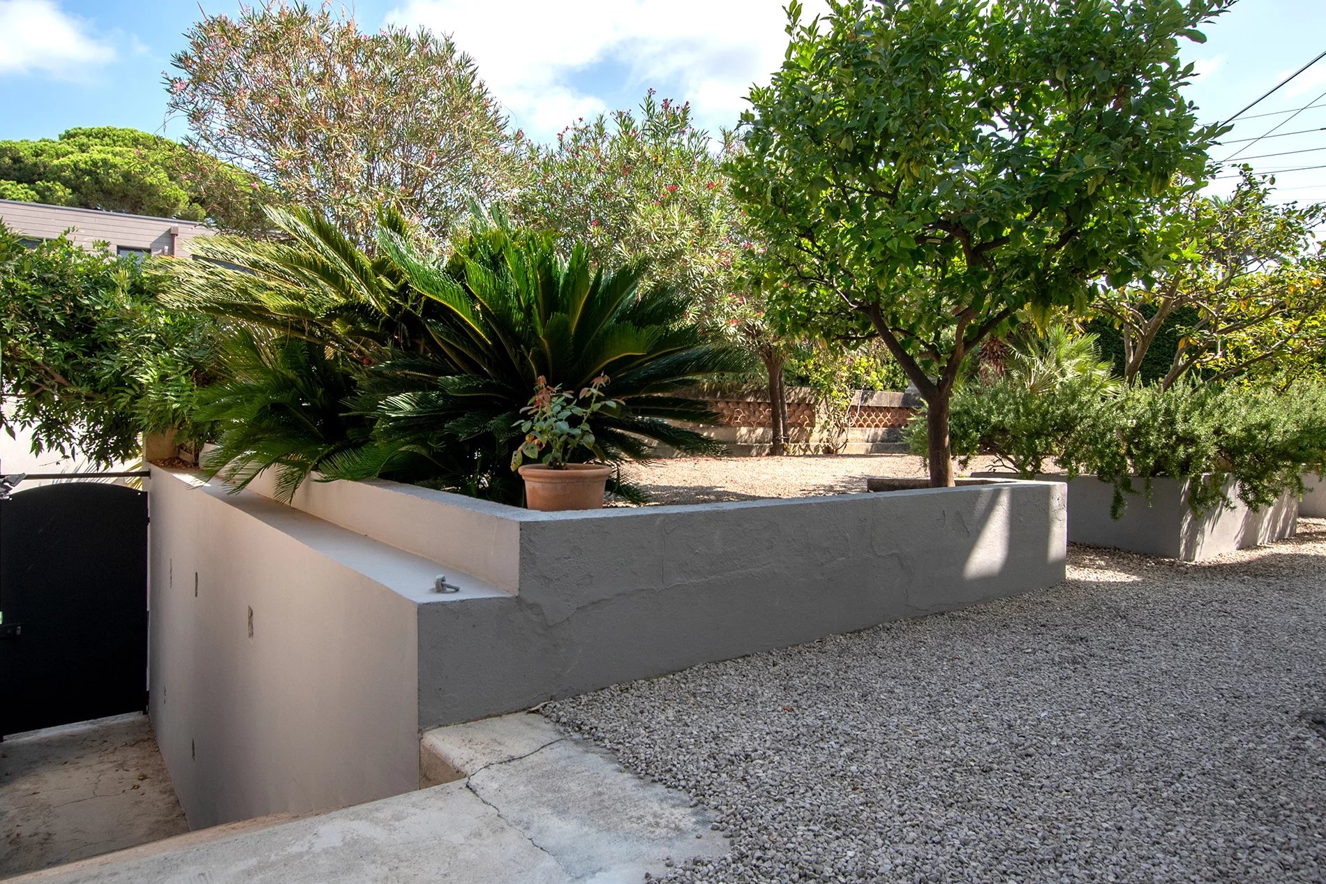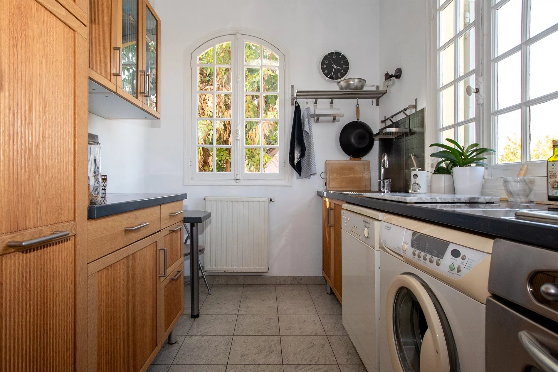 Le rez-de-jardin (82 m²) est aménagé comme suit : Une salle à manger avec cuisine ouverte, deux salons avec accès direct au jardin, orientés au sud et à l'ouest. En outre, il y a deux chambres avec salle de douche en-suite, offrant des options de vie flexibles. La propriété dispose également d'un grand garage et d'une cave attenante. Le jardin de style méditerranéen est baigné de soleil et offre des vues sur le charmant village de Cagnes-sur-Mer.