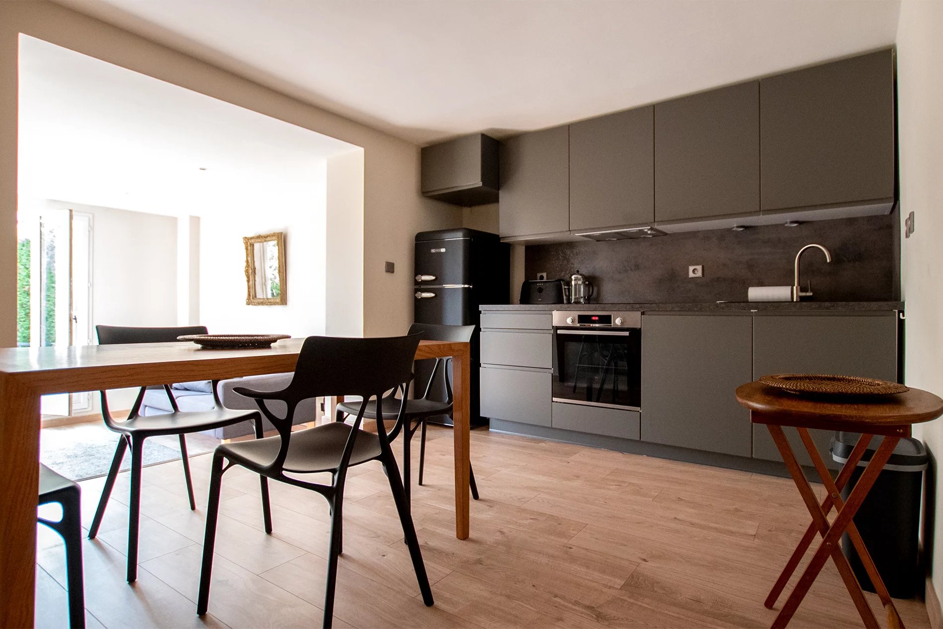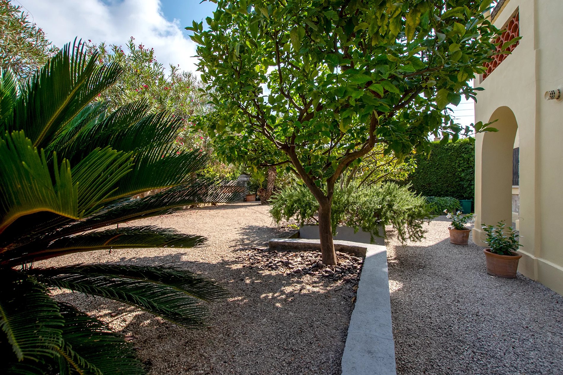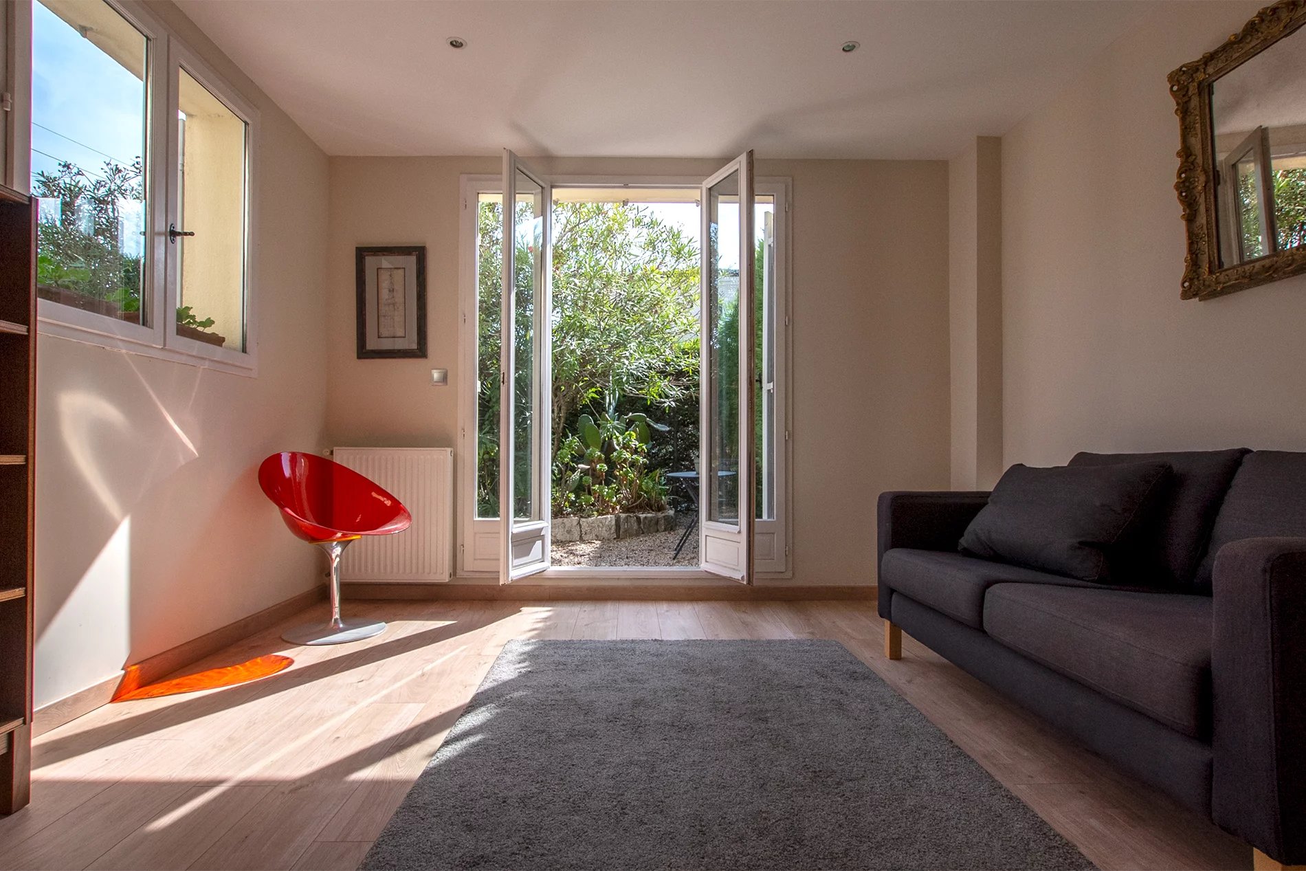 Le rez-de-jardin (82 m²) est aménagé comme suit : Une salle à manger avec cuisine ouverte, deux salons avec accès direct au jardin, orientés au sud et à l'ouest. En outre, il y a deux chambres avec salle de douche en-suite, offrant des options de vie flexibles. La propriété dispose également d'un grand garage et d'une cave attenante. Le jardin de style méditerranéen est baigné de soleil et offre des vues sur le charmant village de Cagnes-sur-Mer.