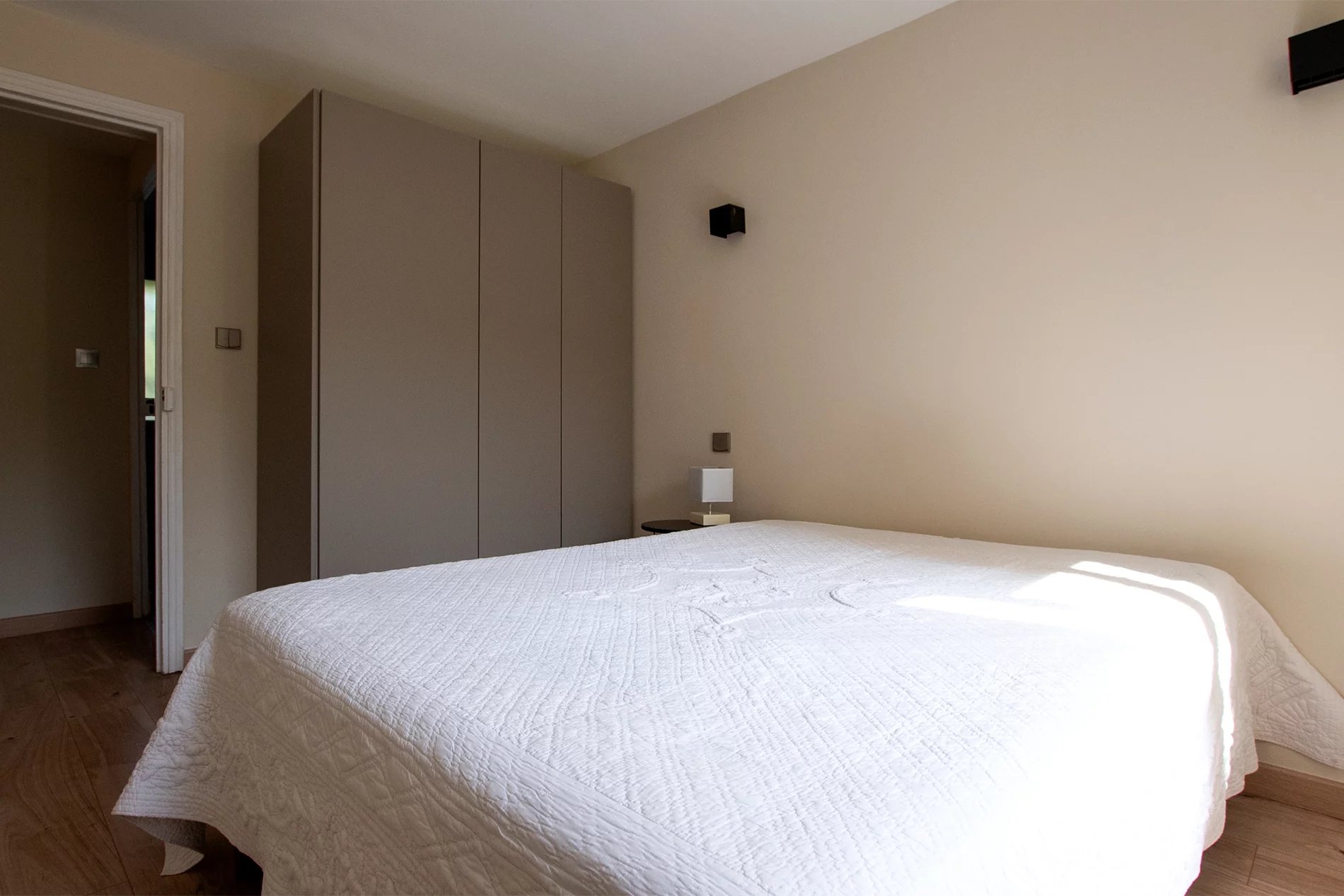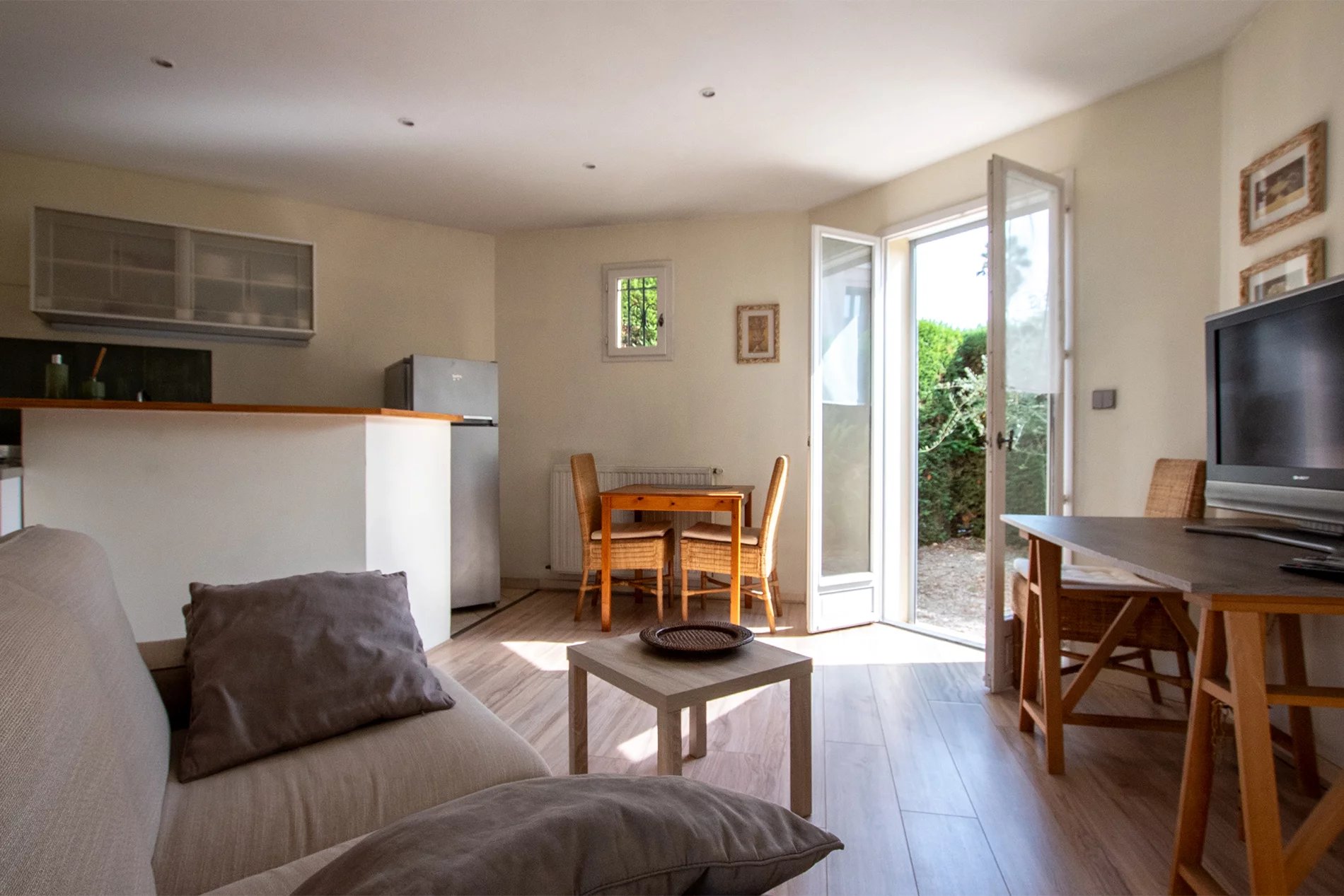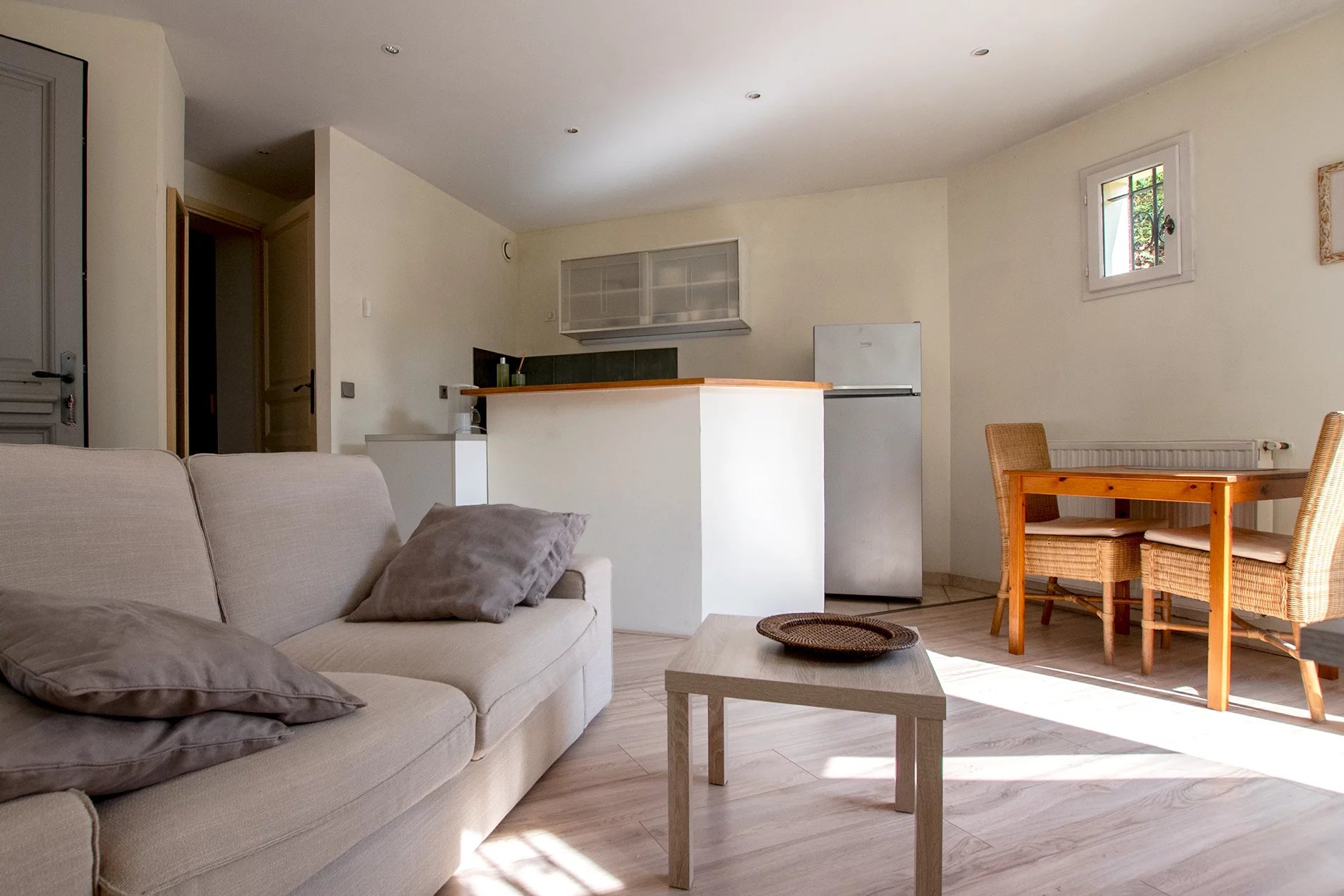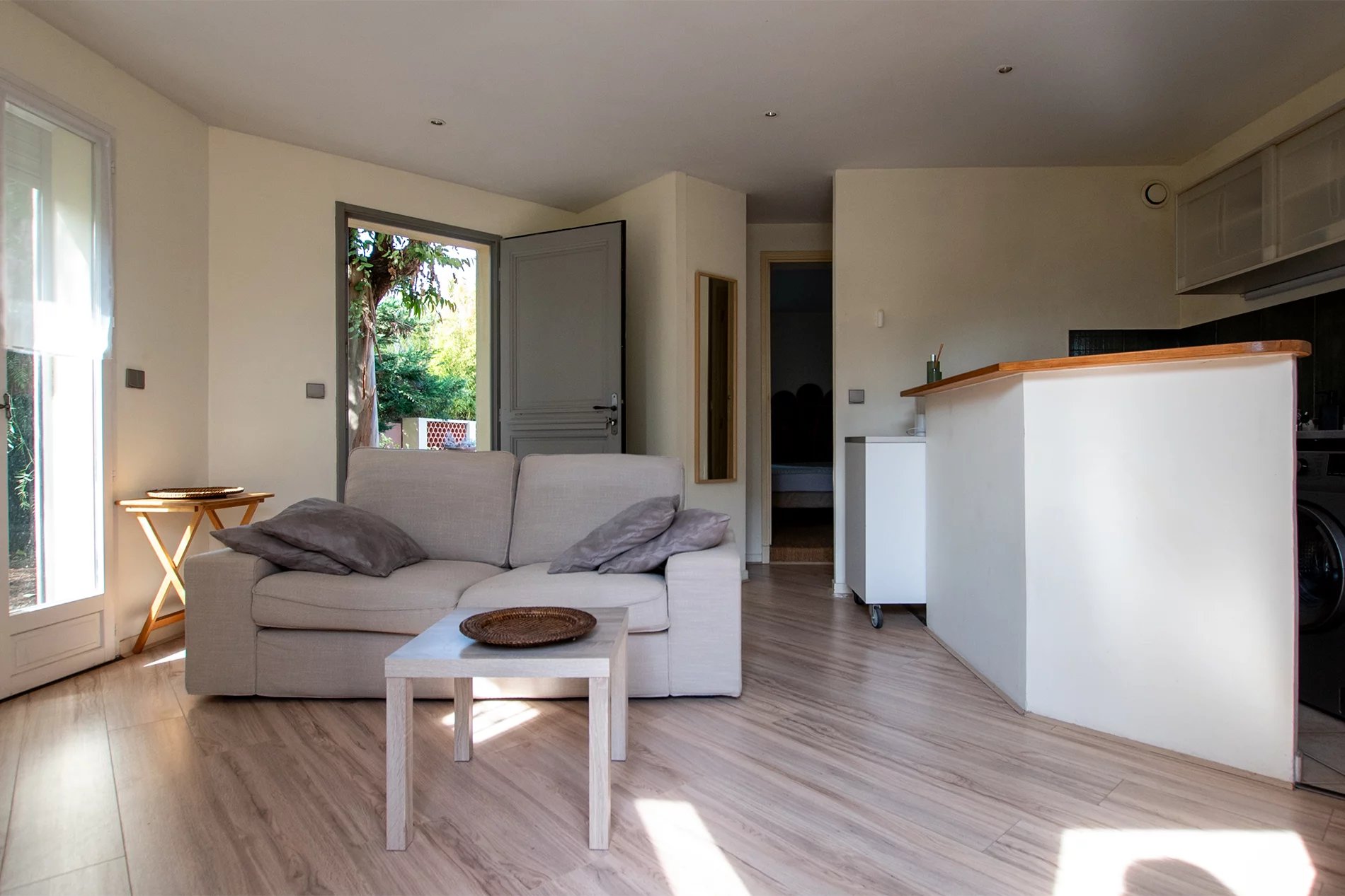 Le rez-de-jardin (82 m²) est aménagé comme suit : Une salle à manger avec cuisine ouverte, deux salons avec accès direct au jardin, orientés au sud et à l'ouest. En outre, il y a deux chambres avec salle de douche en-suite, offrant des options de vie flexibles. La propriété dispose également d'un grand garage et d'une cave attenante. Le jardin de style méditerranéen est baigné de soleil et offre des vues sur le charmant village de Cagnes-sur-Mer.