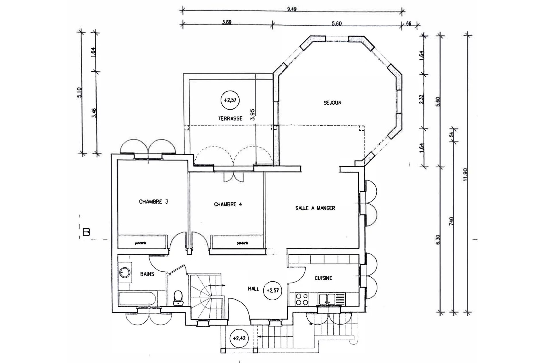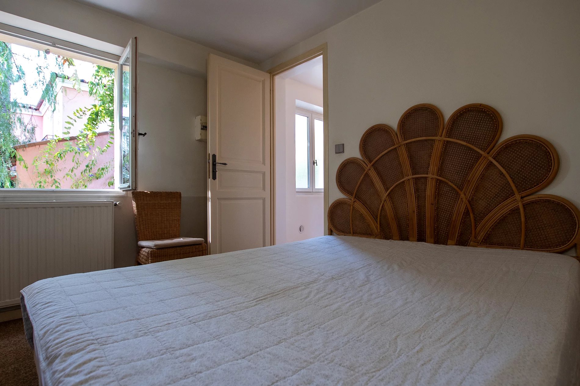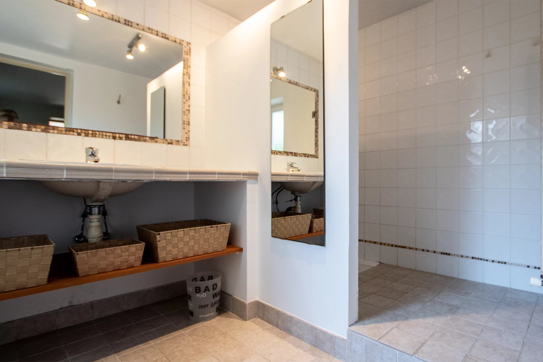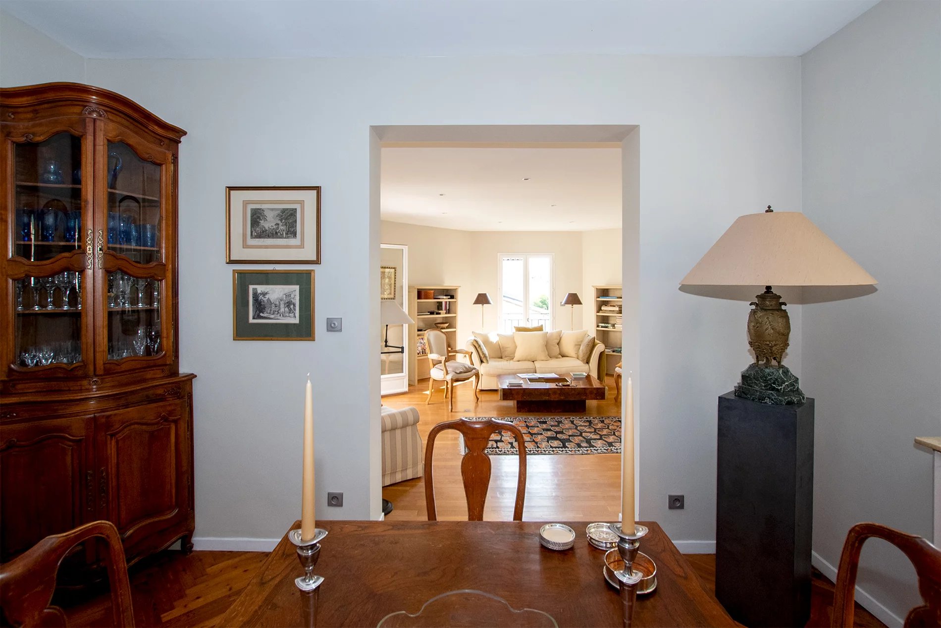 La maison a été rénovée et comprend deux étages offrant 7 pièces : À l'étage supérieur, un grand hall d'entrée avec de hauts plafonds et du parquet vous accueille, menant à une salle à manger et un salon lumineux, tous deux dotés de parquet d'origine et s'ouvrant sur une terrasse ensoleillée de 14 m². Ce niveau comprend également deux chambres avec placards, une cuisine, une salle de bains et un WC séparé. Un élégant escalier dans le hall d'entrée, actuellement inutilisé, relie l'étage supérieur au rez-de-jardin.