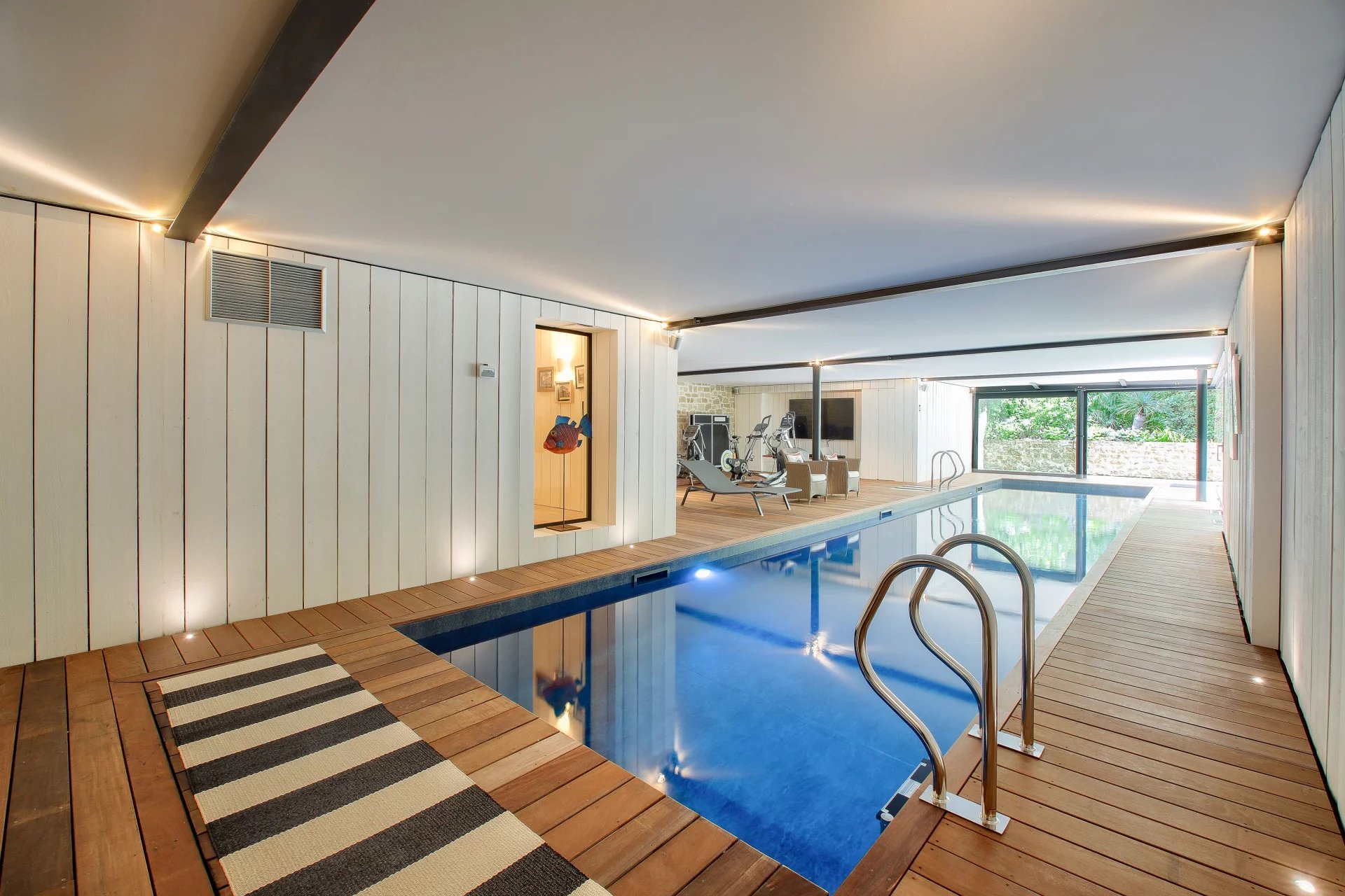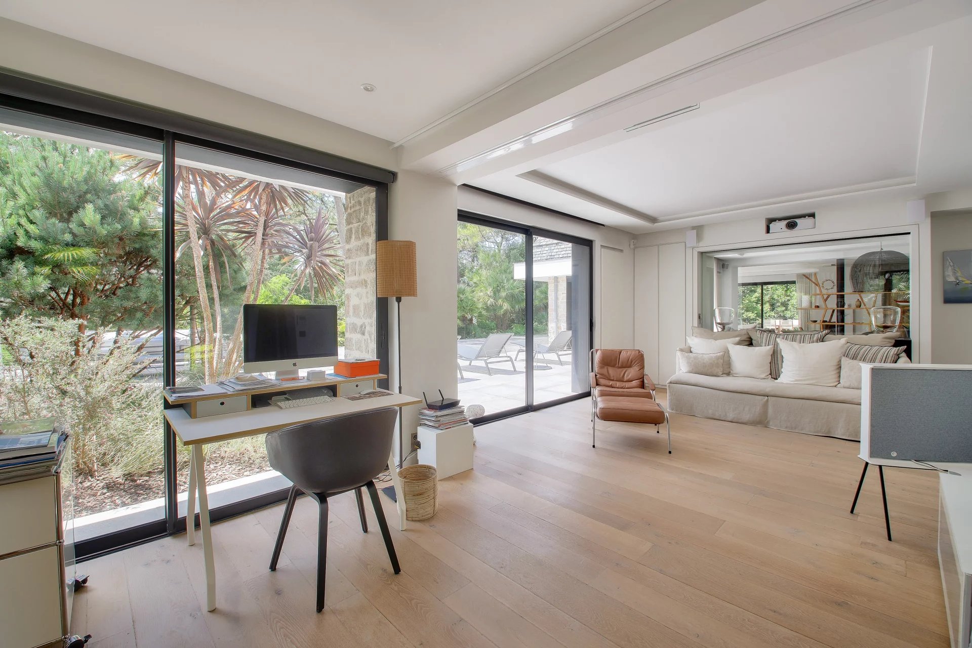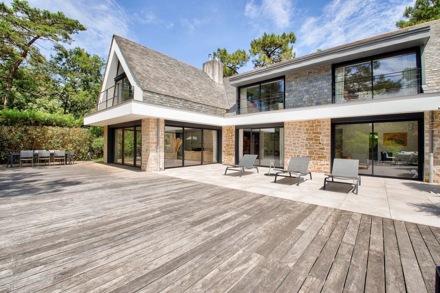 Nichée au cœur du quartier de La Baule-les-Pins, cette somptueuse demeure de 500m² offre intimité et sérénité. Rénovée par un architecte renommé, elle mêle avec élégance la pierre, le bois, l'acier et le verre, offrant une transparence subtile sur son jardin parfaitement paysager. Grandes pièces de réception lumineuses donnant sur une terrasse de 600m2 orientée plein sud. Cuisine séparée personnalisée en pierre béton et bois massif avec une cheminée, un home cinéma - bureau - chambre, cinq suites offrant chacune une salle de bains haut de gamme et un dressing. Au rez-de-jardin, vous trouverez une piscine intérieure de 15 mètres de long, chauffée, une salle de sport et un espace détente, comprenant un hamman et un spa. Une belle cave à vin en sous-sol et un grand garage fermé.