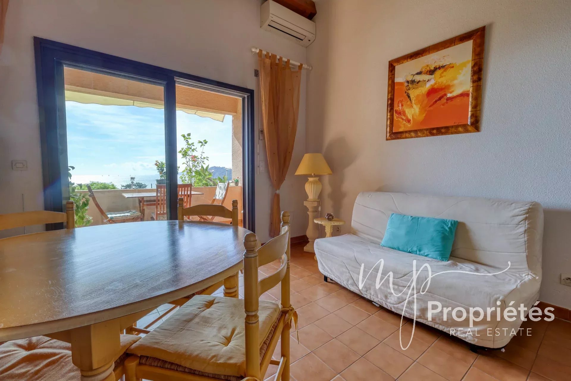 Le séjour, agrémenté d'une cuisine ouverte sur le séjour équipée et aménagée, est baigné de lumière grâce à ses larges baies vitrées. Il s'ouvre sur un superbe balcon-terrasse avec une vue imprenable sur la mer et les iles d’or, cap negre et cap benat parfait pour savourer les douces soirées d'été tout en admirant les paysages enchanteurs.