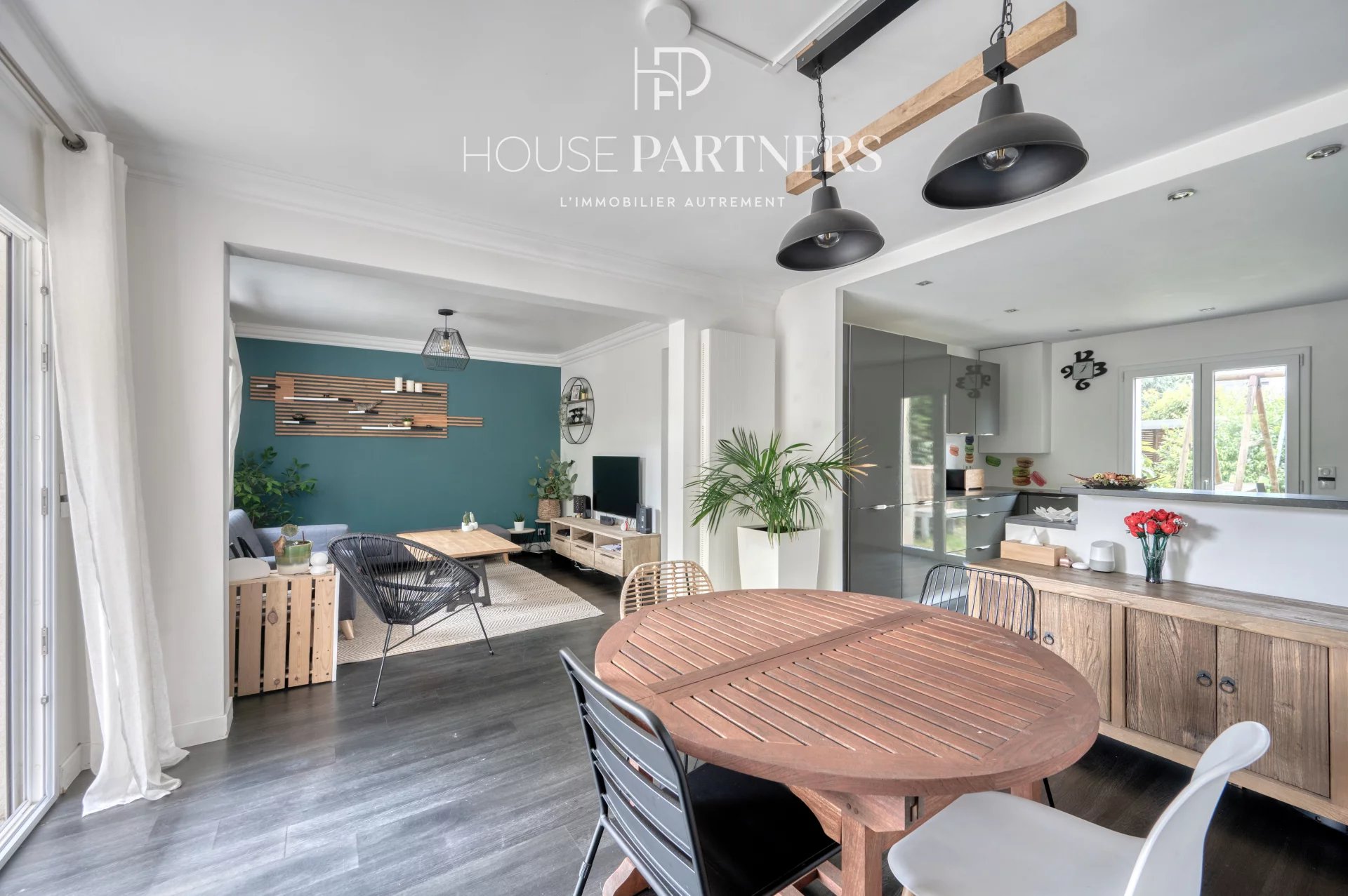Entrée, séjour/salle à manger, cuisine ouverte et équipée, le tout donnant sur une belle terrasse ainsi qu'un jardin.