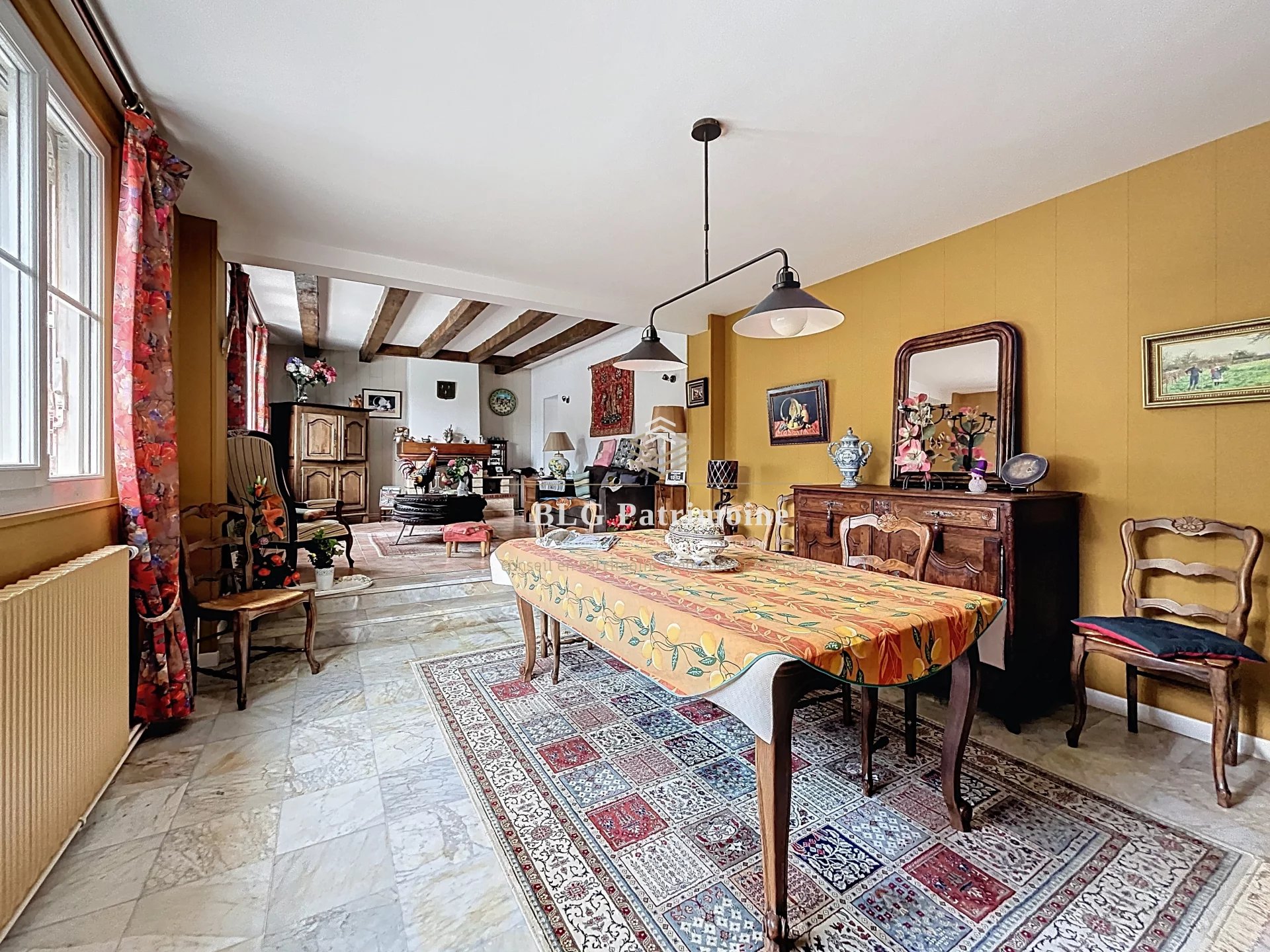Au rez-de-chaussée : une entrée, un grand séjour / salle à manger, une cuisine, une chambre, un bureau, une salle de bain, une buanderie et des WC séparés.