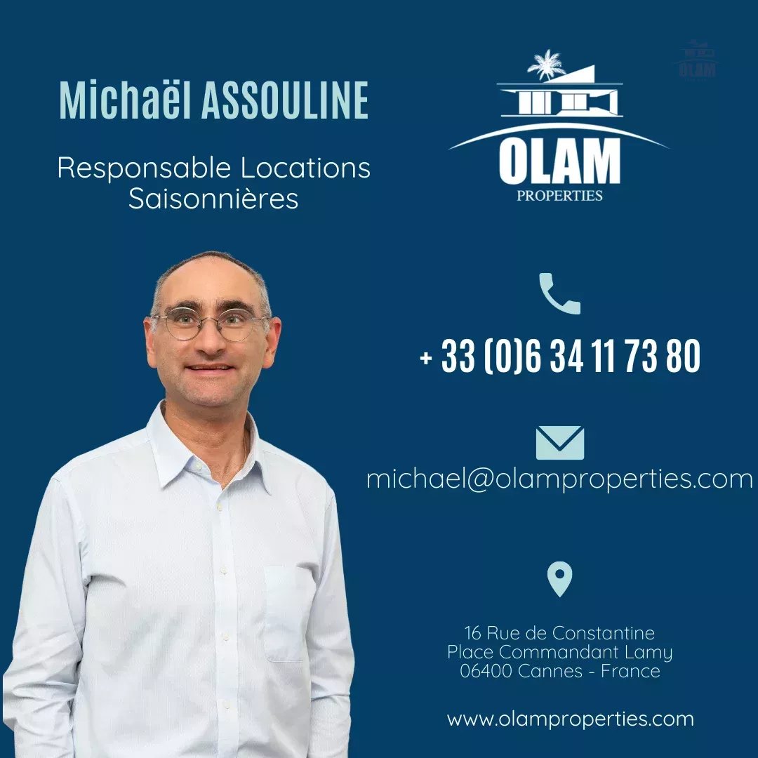 Avec plus de 10 ans d’expérience en location saisonnière haut de gamme à Cannes, notre agence Olam Properties vous propose ce bien coup de cœur pour un séjour sans compromis, où confort, style et emplacement s’unissent à merveille.
