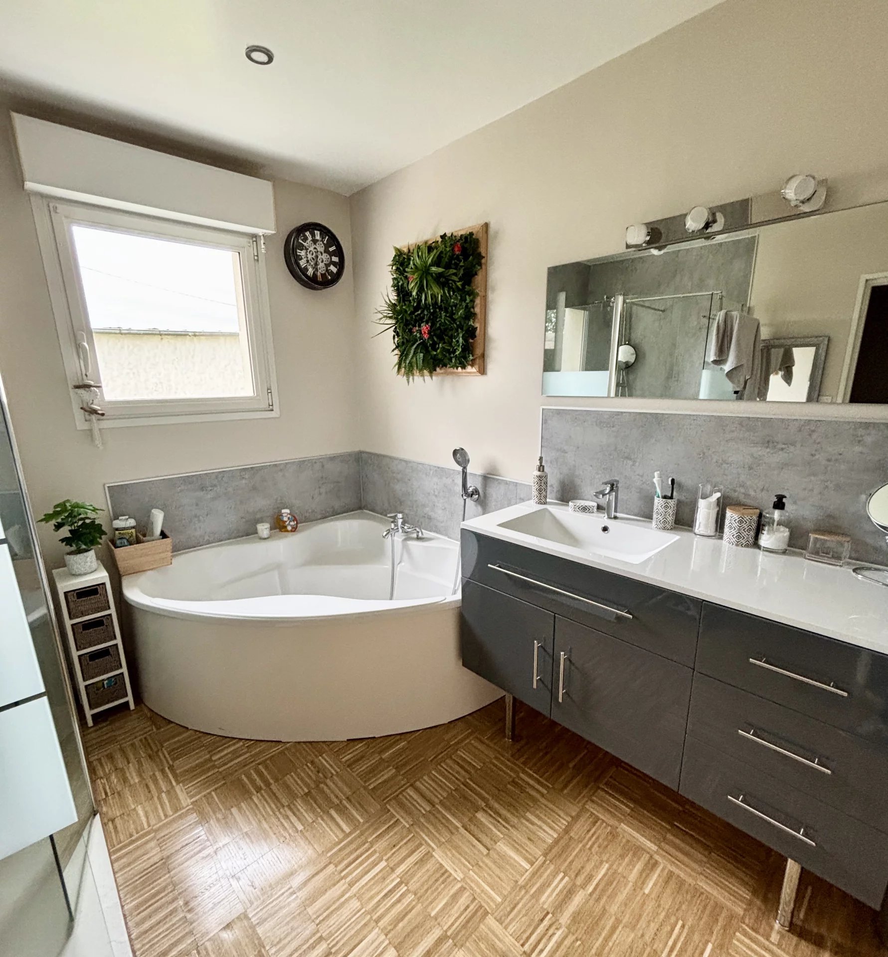À l’étage : deux chambres supplémentaires, un vaste palier pouvant faire office de bureau ou de salle de jeux, ainsi qu’une salle de douche avec dressing.