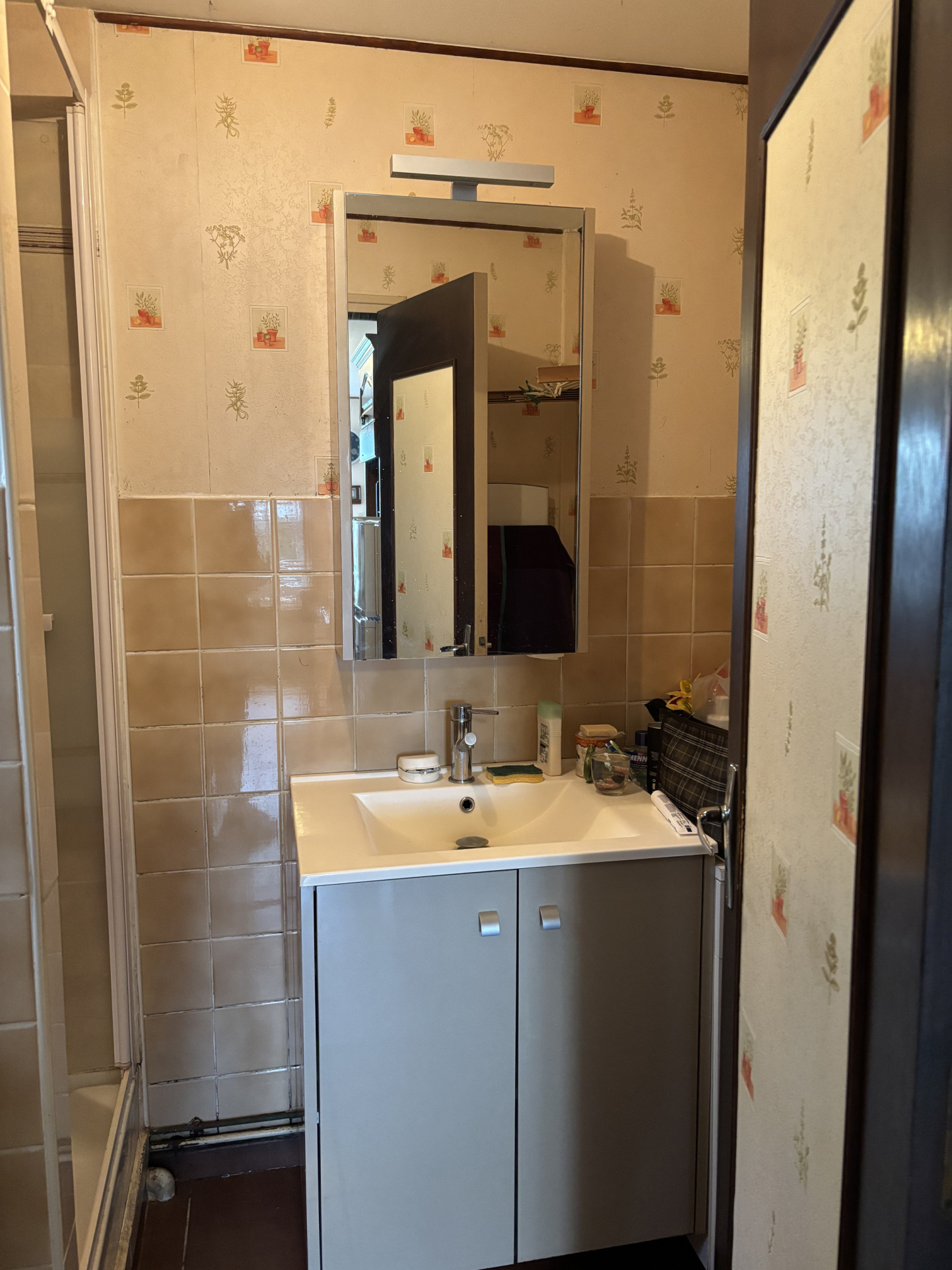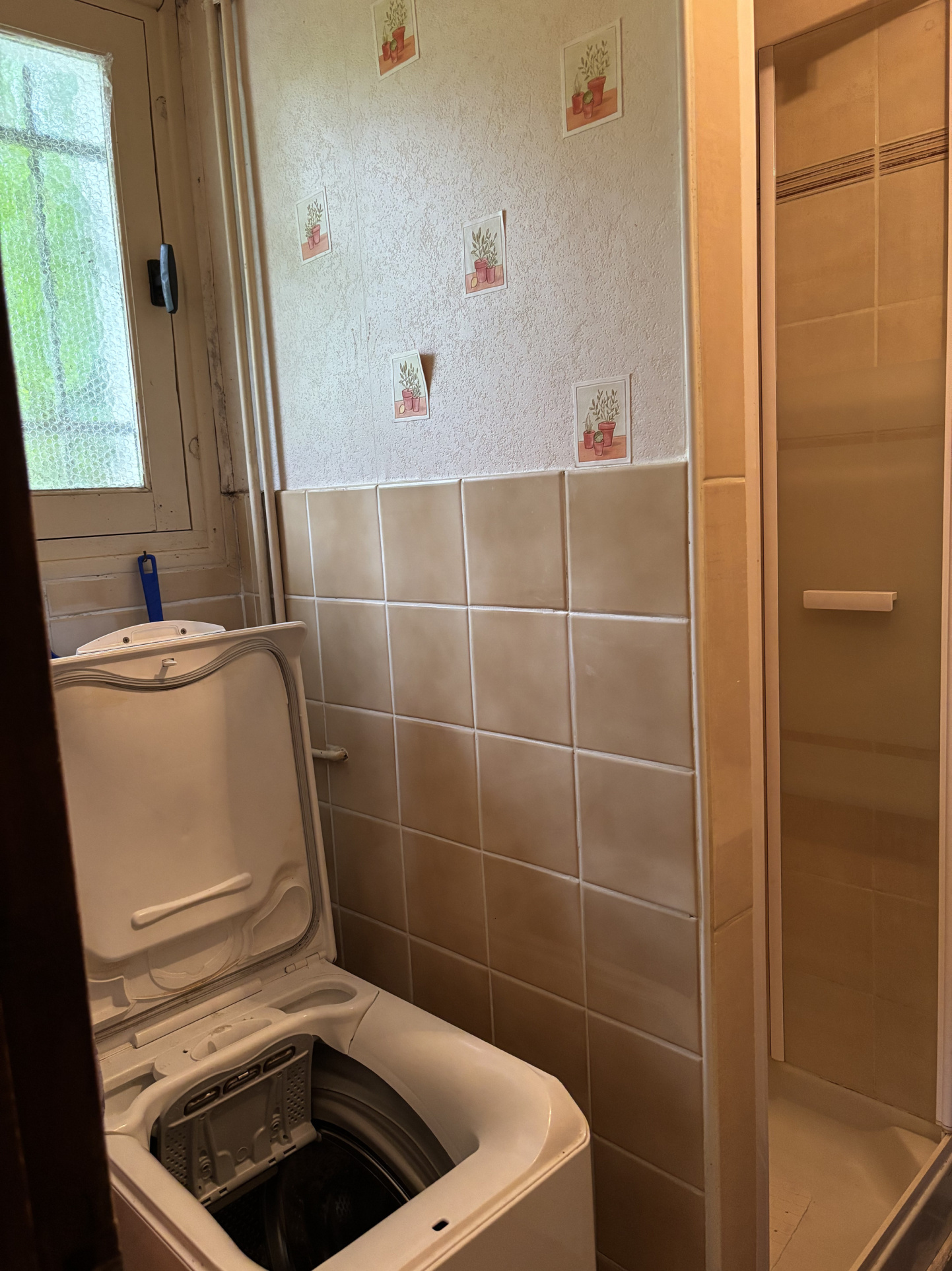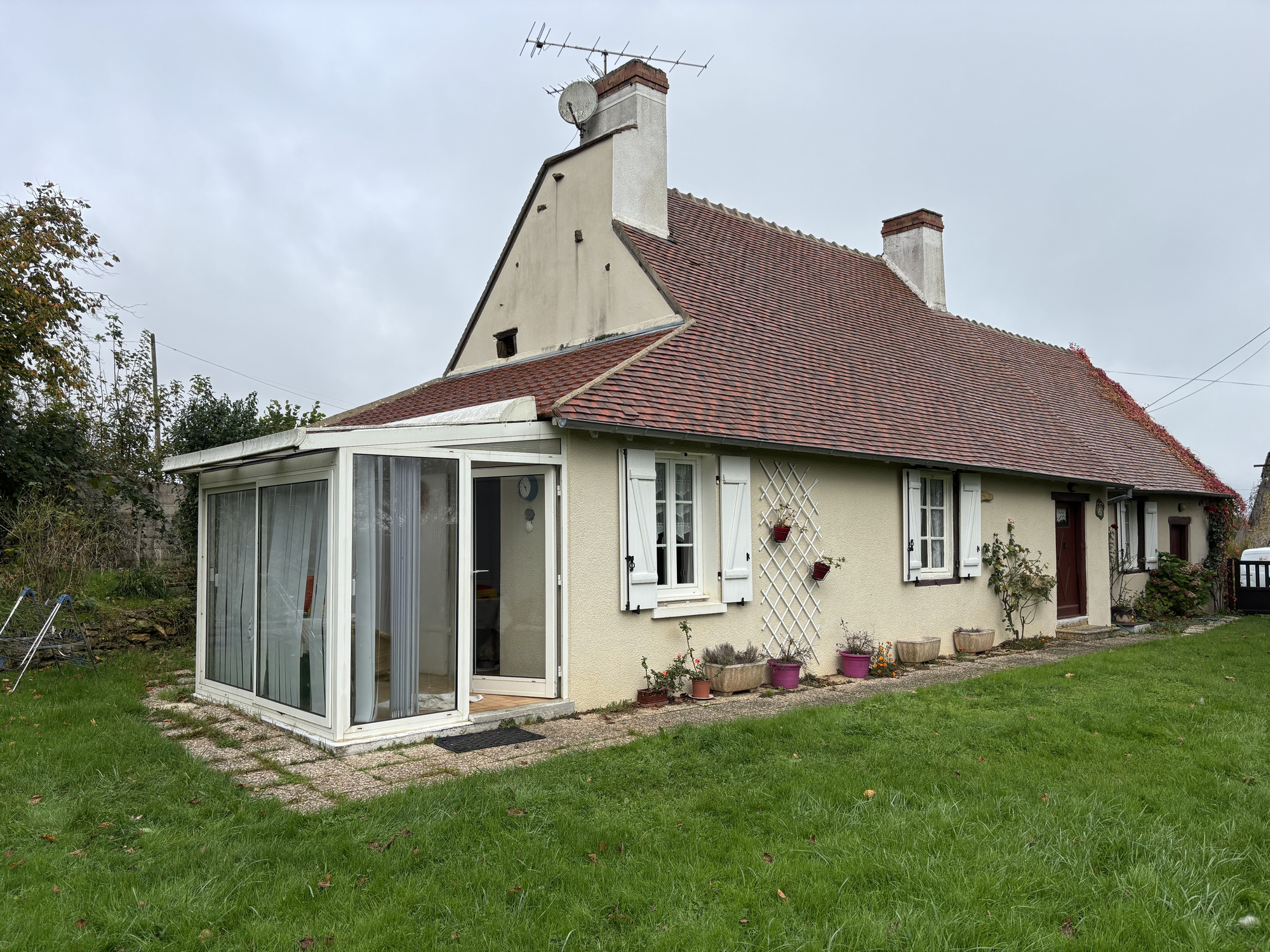 L'entrée se fait par une véranda lumineuse, entièrement vitrée, qui offre une vue magnifique sur le jardin. De là, on accède à la cuisine, équipée de plaques électriques et d'un lave-vaisselle encastré. À l'arrière de la cuisine se trouve une salle d'eau avec douche, lavabo et raccordement pour une machine à laver.
