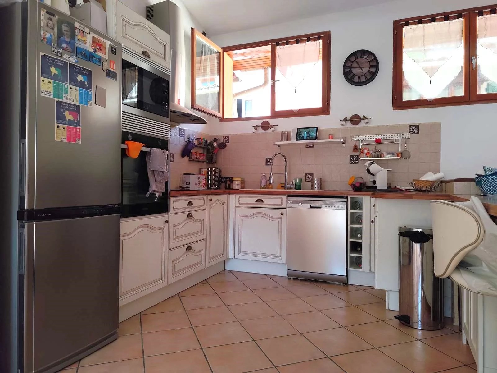 3ème : cuisine américaine toute équipée ouverte sur le séjour avec une mezzanine accueillant un lumineux salon avec vue sur le village et montagnes.