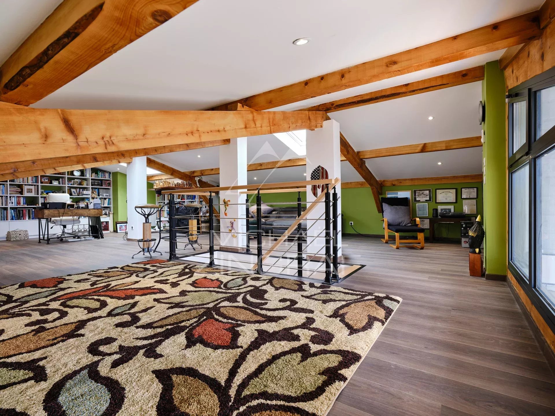 - À l'étage, un élégant escalier en bois, mène à une vaste mezzanine, actuellement aménagée en salle de lecture, bibliothèque et home cinéma, avec la possibilité d'ajouter une chambre supplémentaire.