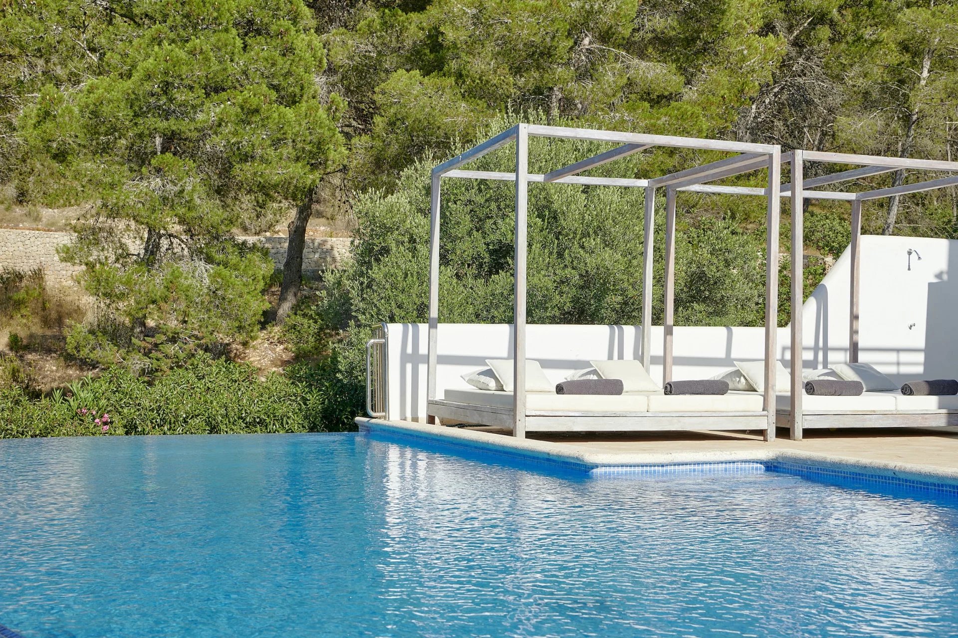 À l'extérieur, la piscine à débordement est entourée de zones de détente.