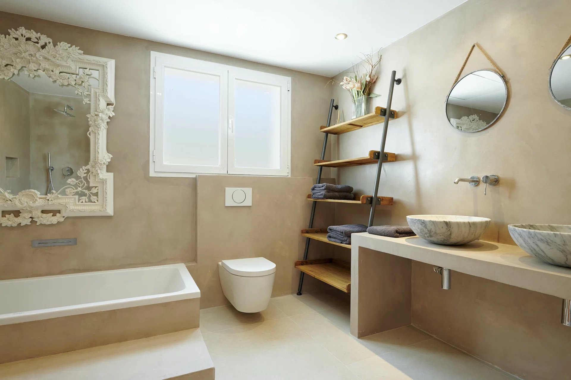 Le niveau supérieur comprend la chambre principale avec une salle de bains privative et un grand dressing, ainsi qu'une terrasse privée. À côté de la chambre principale se trouve un bureau ou une 6ème chambre avec vue sur la mer.
