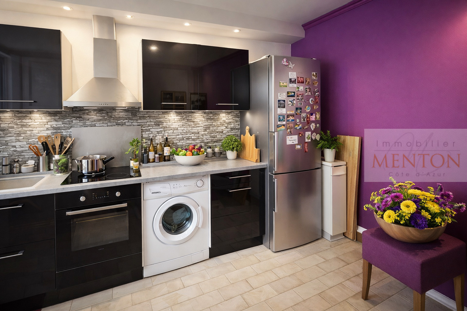 Sur la commune de Menton, proche de l'A8, de l'intermarché, de l'école, exposition sud-ouest, au calme, vue dégagée, 3 pièces lumineux au 2ème et dernier étage, sans ascenseur, en exposition sud-ouest, + couchage sur mezzanine de 11 m2 . Cet appartement allie charme et confort dans un quartier familial et paisible , en bon état, il offre un espace de vie chaleureux prolongé par une belle terrasse exposée sud-ouest, parfaite pour des repas en plein air ! Il s'agit d'un appartement composé au niveau 0 d'une entrée, beau séjour lumineux ,cuisine séparée, WC invité, belle terrasse