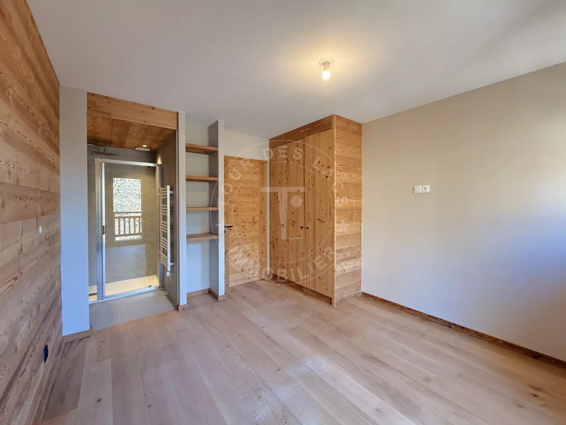 Il est disposé comme suit : une belle entrée, un ski-room, un wc, une chambre en suite avec salle de douche, une chambre, une salle de bain-wc, un salon-séjour-cuisine ouvert de plus de 36 m2 avec accès à un balcon. Un autre balcon orienté à l’ouest dessert les 2 chambres.