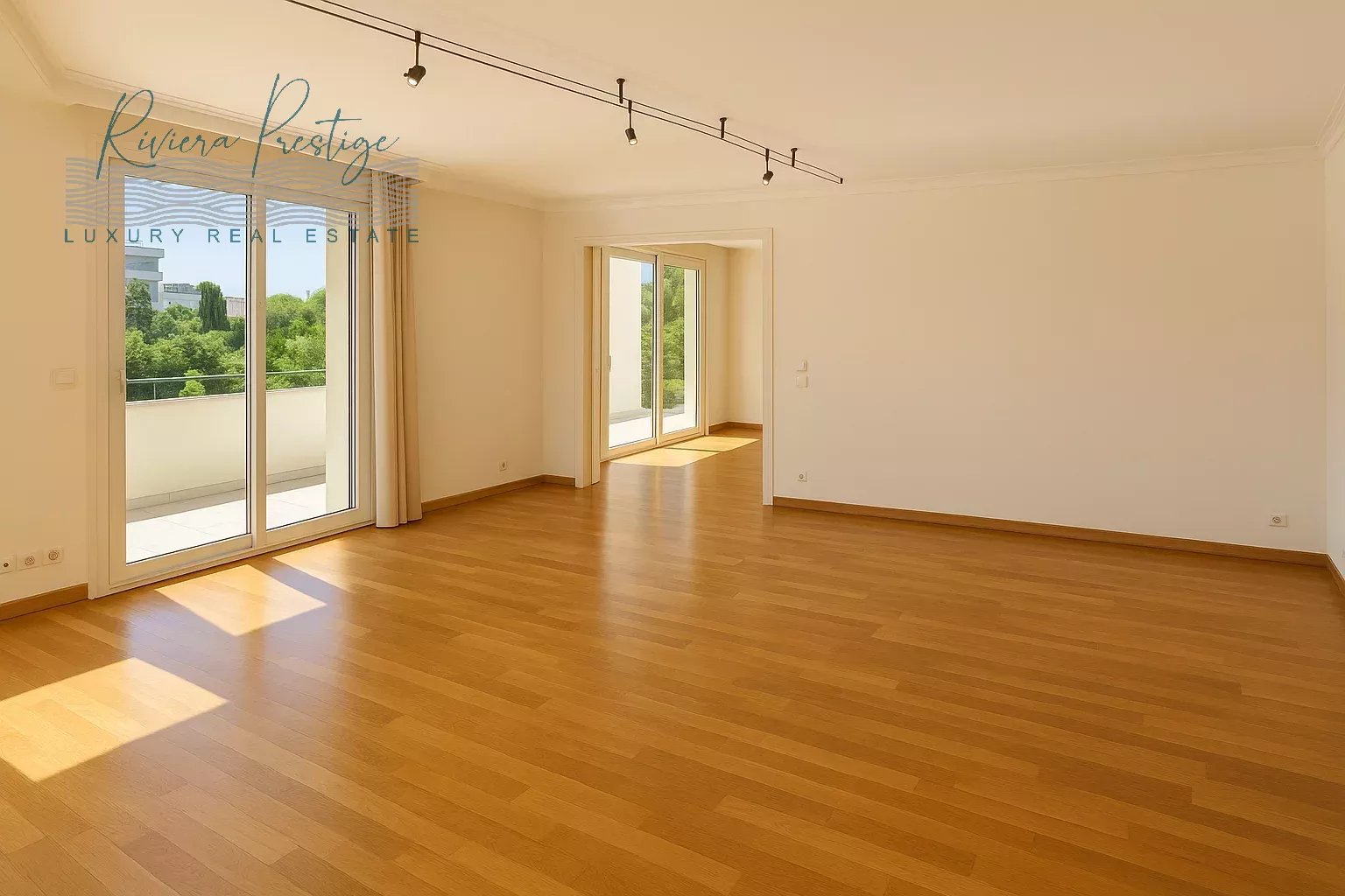 Dernier étage en angle pour ce 4 pièces de 142 m² situé à 800 m de la rue d'Antibes. Résidence de standing avec piscine et espaces verts, cet appartement a une vue dégagée sur la colline de la Californie. Vaste séjour, cuisine équipée, une master suite de 22 m², une salle de douche hammam, WC et dressing. Une chambre de 24 m², une salle de bains et WC. Une chambre de 12 m². Une buanderie avec possibilité de créer une salle de douche. Un WC invité et une belle terrasse de 50m². 2 places de parkings en sous sol que l'on peut boxer et 2 caves.