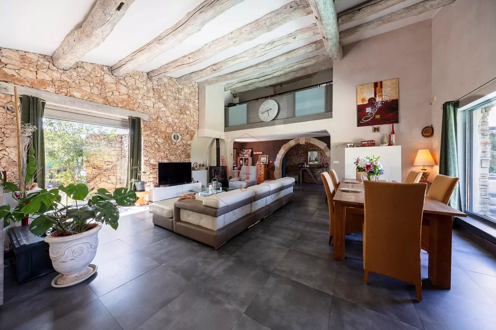 La maison principale, d’une surface d’environ 200 m², s’ouvre sur une vaste pièce de vie baignée de lumière, composée d’une grande cuisine contemporaine avec ilot central, d’une salle à manger et d’un salon chaleureux, sublimé par un poêle à bois, des poutres apparentes et des murs en pierres qui lui confèrent un cachet rare.