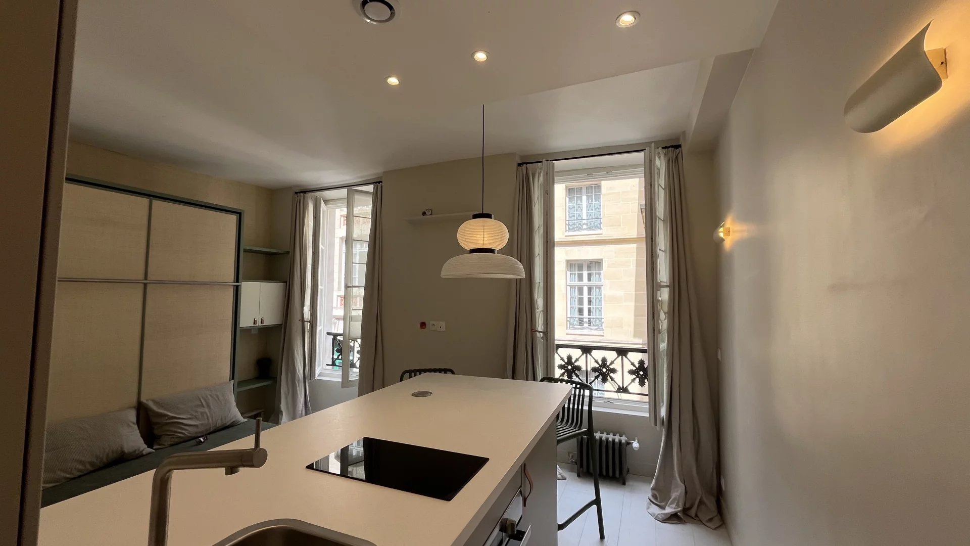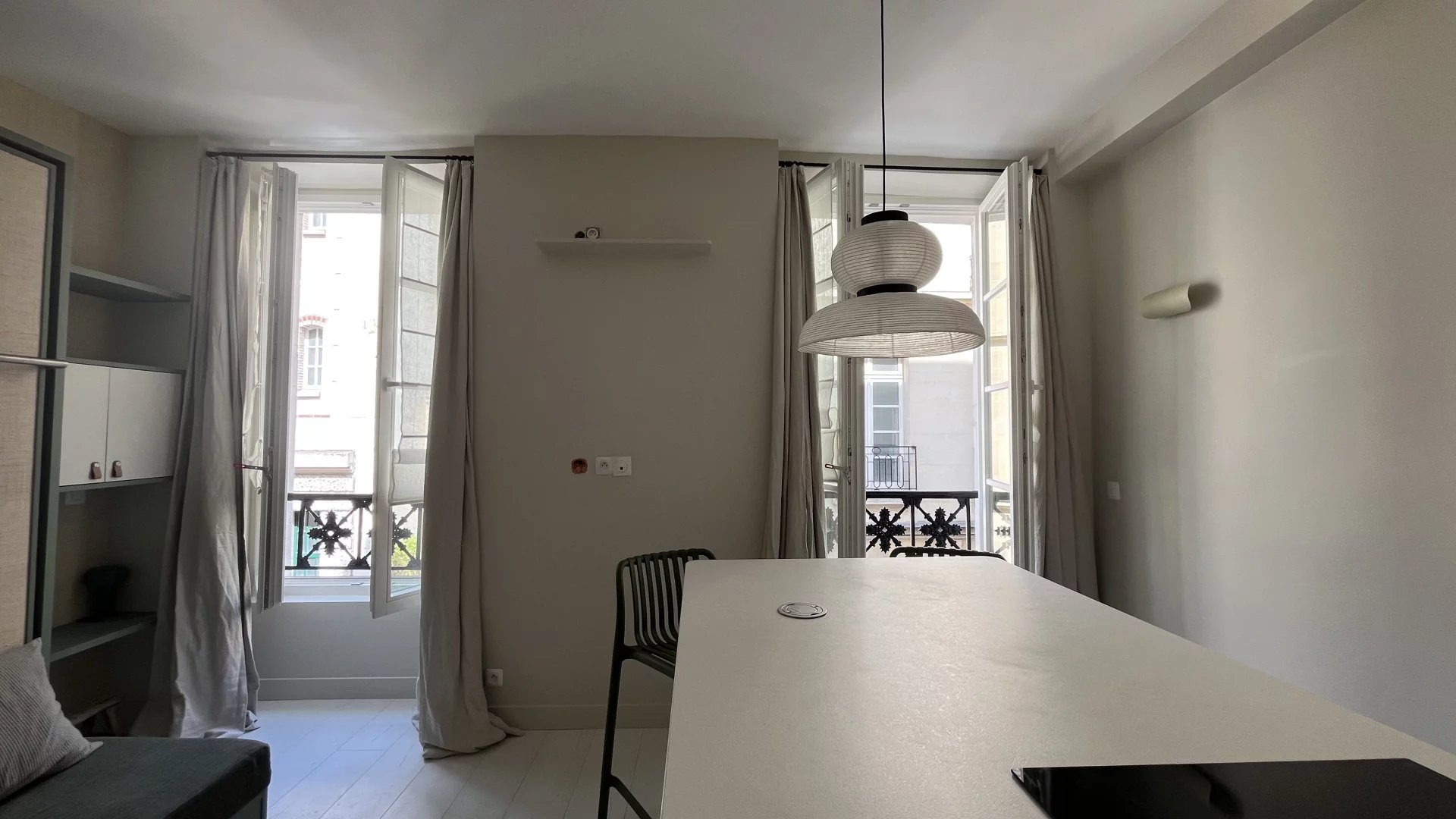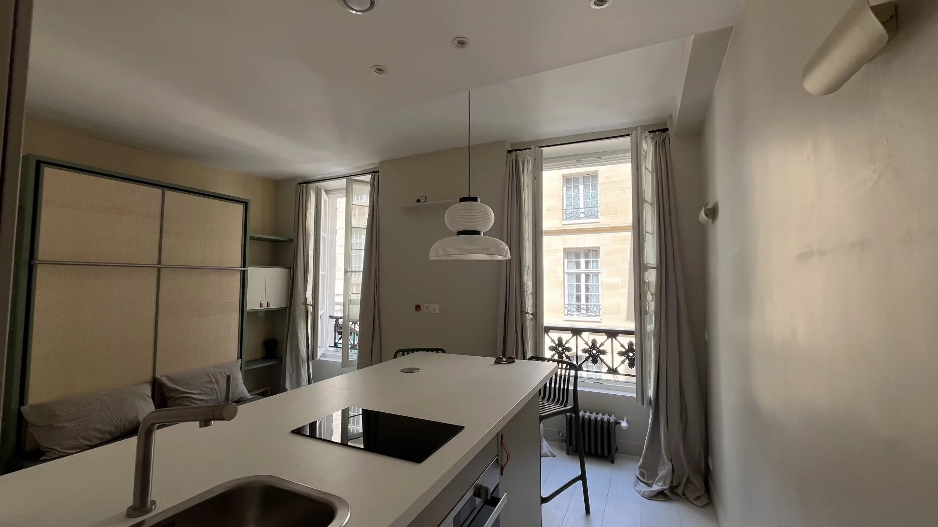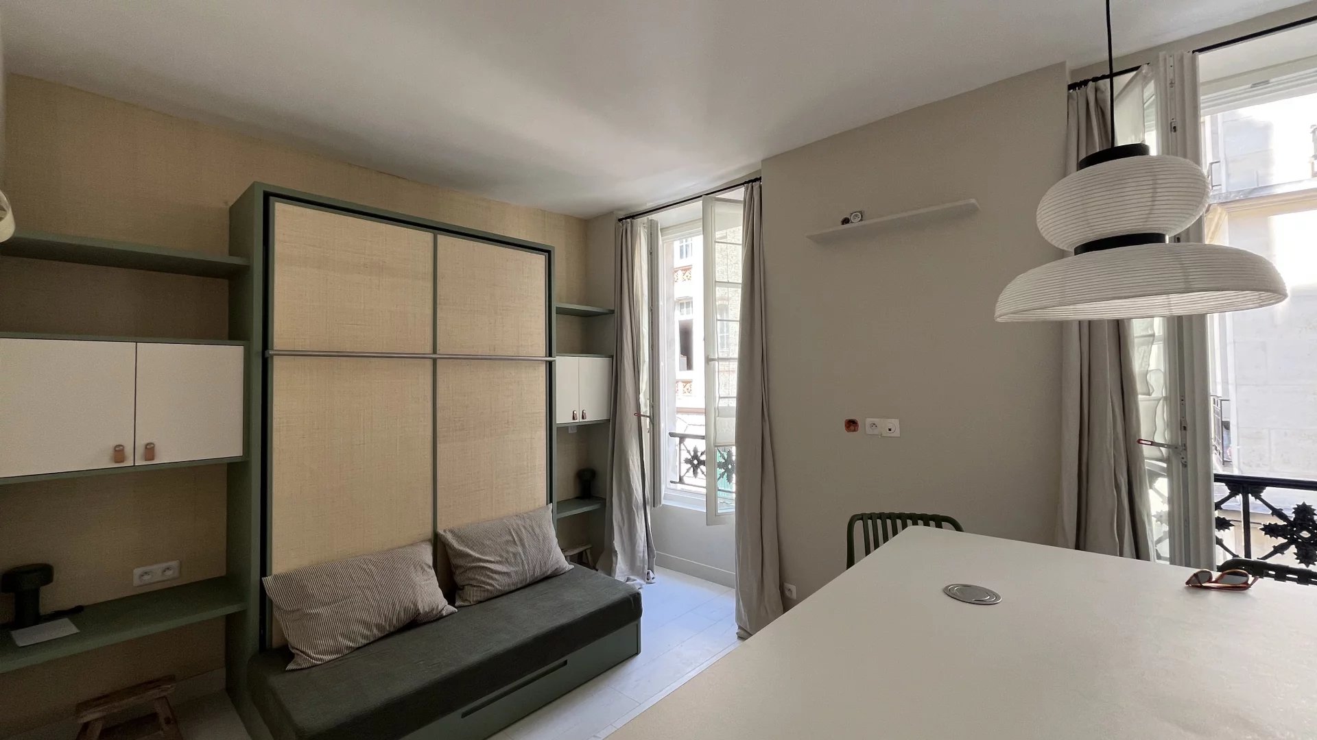 Rue du Jour, un très beau studio entièrement rénové, aménagé et meublé. Il se compose d'une entrée avec placard, un séjour avec 2 fenêtres, cuisine ouverte, canapé-lit déployant, et une salle de douches avec WC, machine à laver. Rénovation de qualité. Chauffage collectif, donc inclus dans les charges. Disponible le 1er septembre 2025.