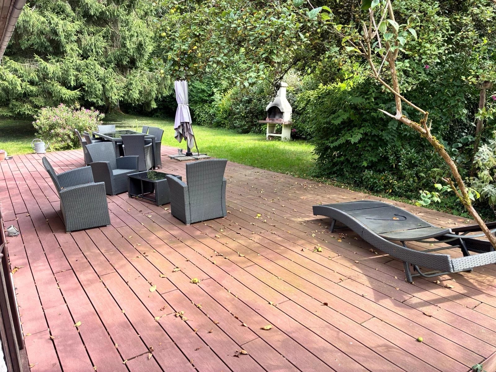 Dans un environnement arboré et sans vis à vis, proche des grands axes et au calme, maison de plain pied sur sous-sol total comprenant une entrée avec placard coulissant distribuant une cuisine aménagée et équipée, une belle pièce de vie avec cheminée et accès terrasse plein sud, un w-c, une salle de douche, 3 chambres dont deux en accès terrasse avec possibilité d'une quatrième traversante, un sous-sol total avec une chambre ou bureau possible, stationnements, rangement, buanderie, chaufferie fioul et bois. Grande parcelle de 3 052m2 avec hangar. Beau potentiel...