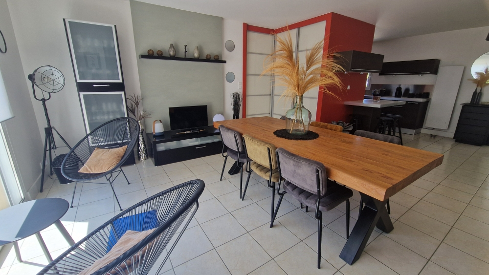 Sur 725 m² clos, Très belle maison de plain-pied de 143 m² habitable comprenant : Entrée, séjour salle à manger avec cuisine équipée, salon, dégagement placards, trois chambres, wc, salle d'eau, suite parentale avec une chambre, dressing, salle d'eau, wc. Lingerie - Garage - Abri voitures - stationnements voitures + camping car Jardin - terrasse - Piscine Chauffée avec nage à contre courant. Les informations sur les risques auxquels ce bien est exposé sont disponibles sur le site Géorisques : www.georisques.gouv.fr Estimation des coûts annuels d'énergie entre 1914 euros et 2590 euros par an (3.66 % honoraires TTC à la charge de l'acquéreur.)