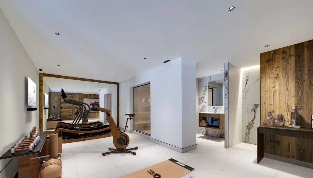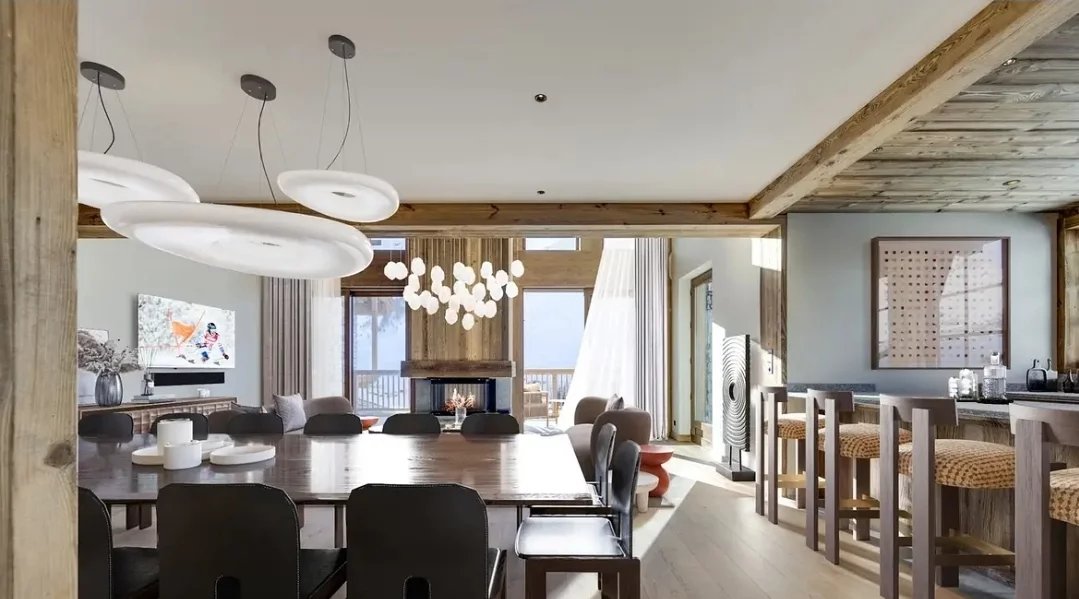 Dès l’entrée, les matériaux nobles, les volumes généreux et la lumière naturelle créent une atmosphère élégante et chaleureuse. Les vastes espaces de réception s’ouvrent sur de larges terrasses exposées sud et ouest, dévoilant une vue imprenable sur la vallée et les sommets enneigés.