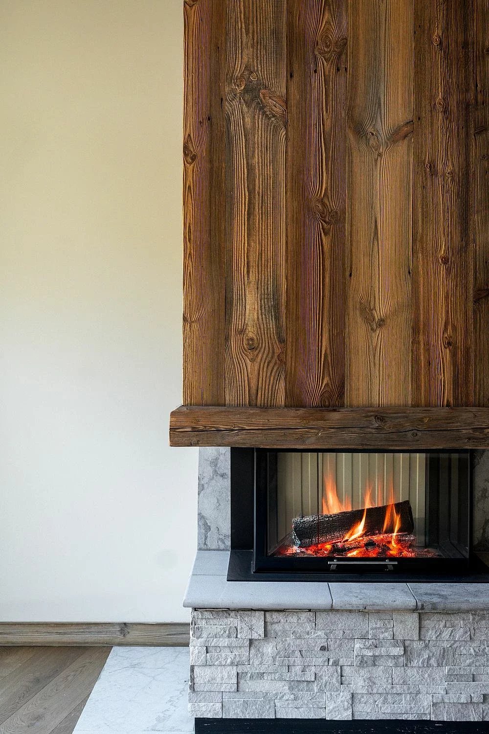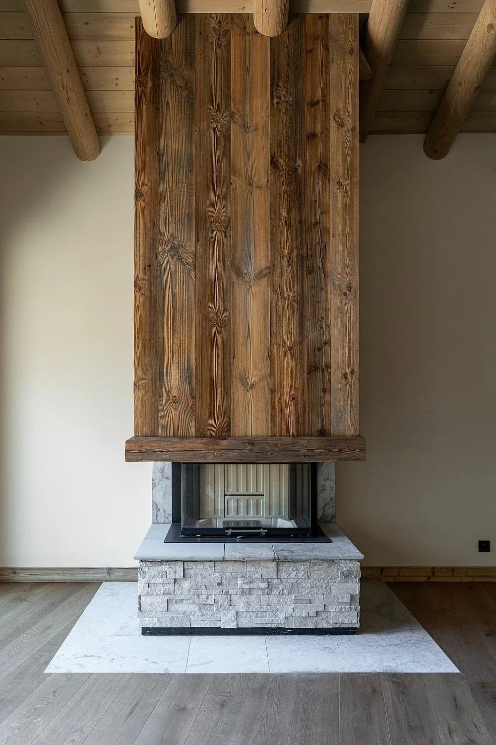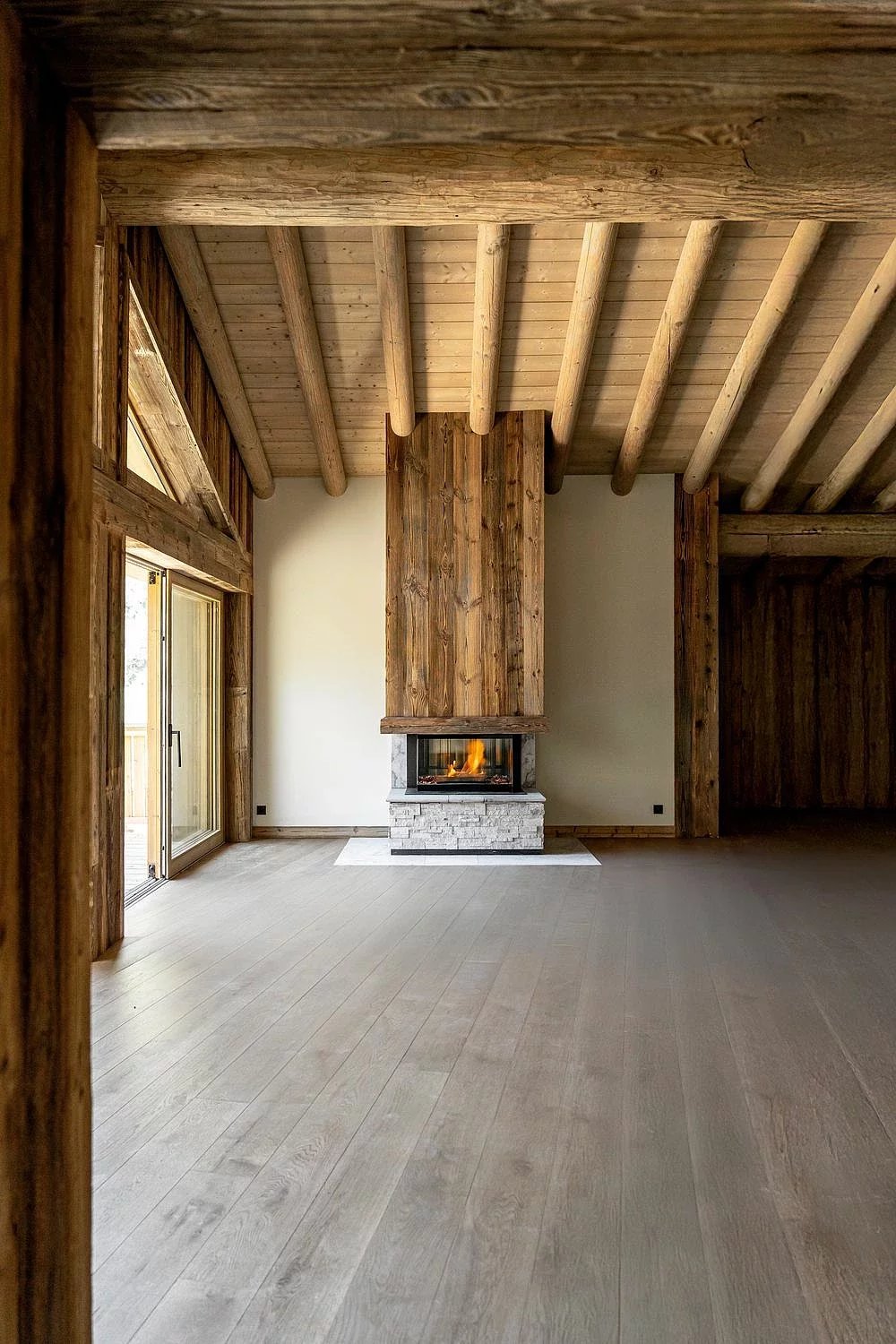 Un séjour cathédrale de 57 m² avec cheminée et grandes baies vitrées ouvrant sur les sommets