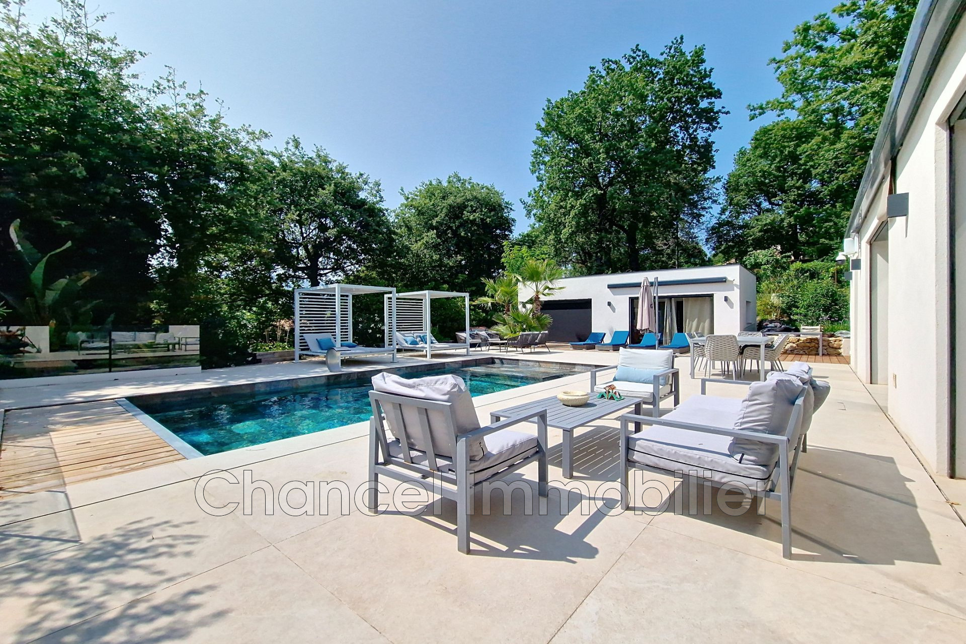 L'extérieur, totalement aménagé, invite à la détente : une piscine moderne, plusieurs espaces de repos, une grande terrasse en bois et carrelage, ainsi qu'un hammam privé pour une expérience bien-être à domicile.