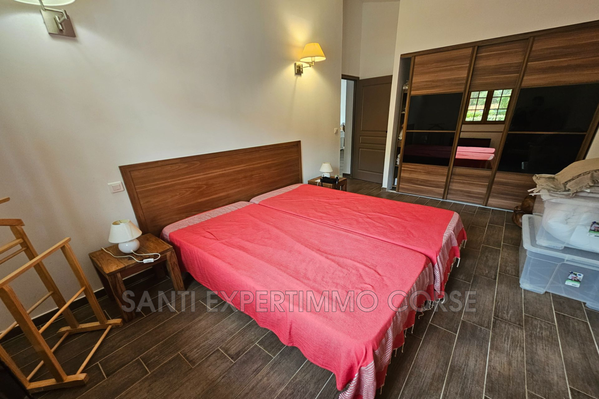 - Séjour (clim) avec beau volume : porte fenêtre donnant sur terrasse semi-couverte vue maquis
