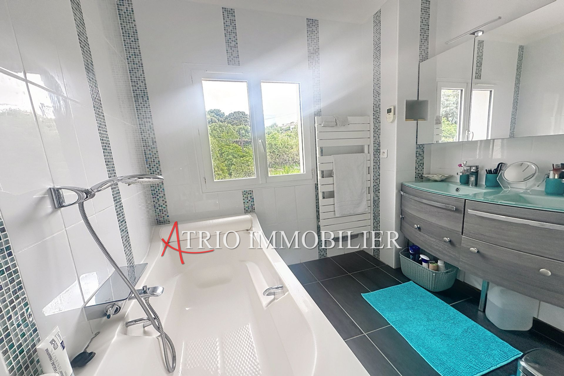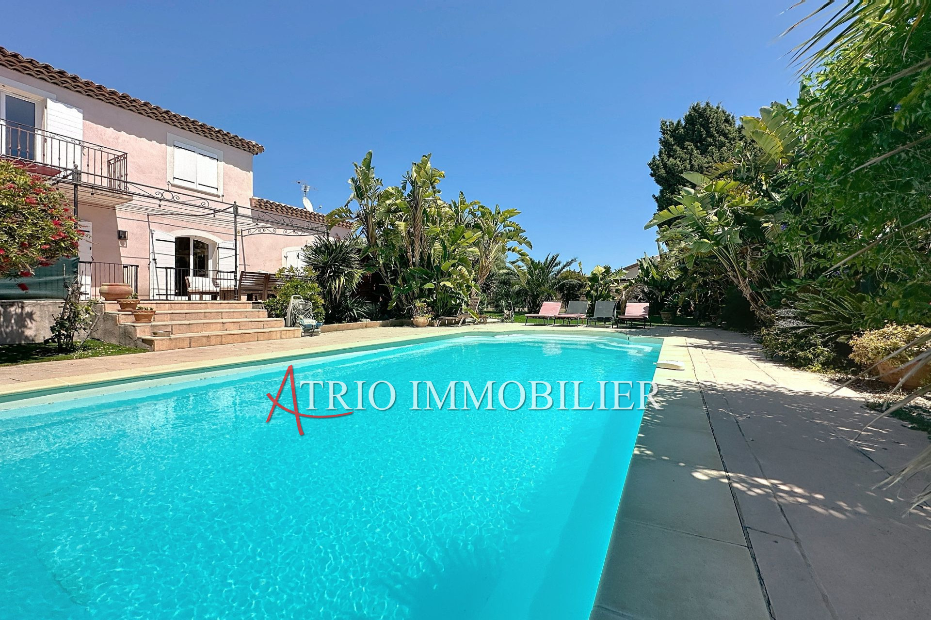 Dans un écrin de verdure à l'abri de toute nuisance et de tout regards, sur une parcelle plate et dominante de 1200m², cette villa offre plus de 225m habitable. De plain-pied : un séjour et salle à manger de 50m² une grande cuisine américaine équipée de type provençale, une buanderie, wc, et un appartement d'environ 35 m² privatif en duplex communiquant à la villa.
