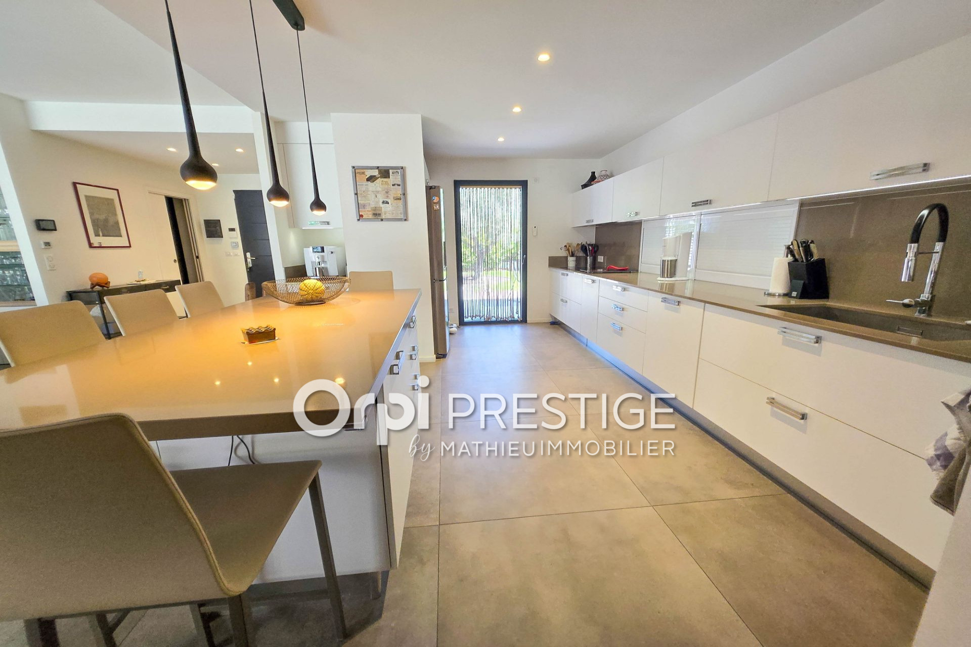 Avec ses 193 m² habitables, la maison, pensée par un architecte d'intérieur, séduit dès l'entrée grâce à ses volumes et sa luminosité. Le vaste séjour de 65 m², avec cheminée suspendue, s'ouvre sur l'extérieur par une baie vitrée à galandage de plus de 5 m. En un instant, la terrasse protégée par une pergola bioclimatique devient le prolongement naturel du salon, idéale pour les petits-déjeuners au soleil ou les soirées d'été. La cuisine américaine, équipée d'appareils Miele et Samsung, dispose d'un large îlot central convivial pour partager les repas en famille ou entre amis.