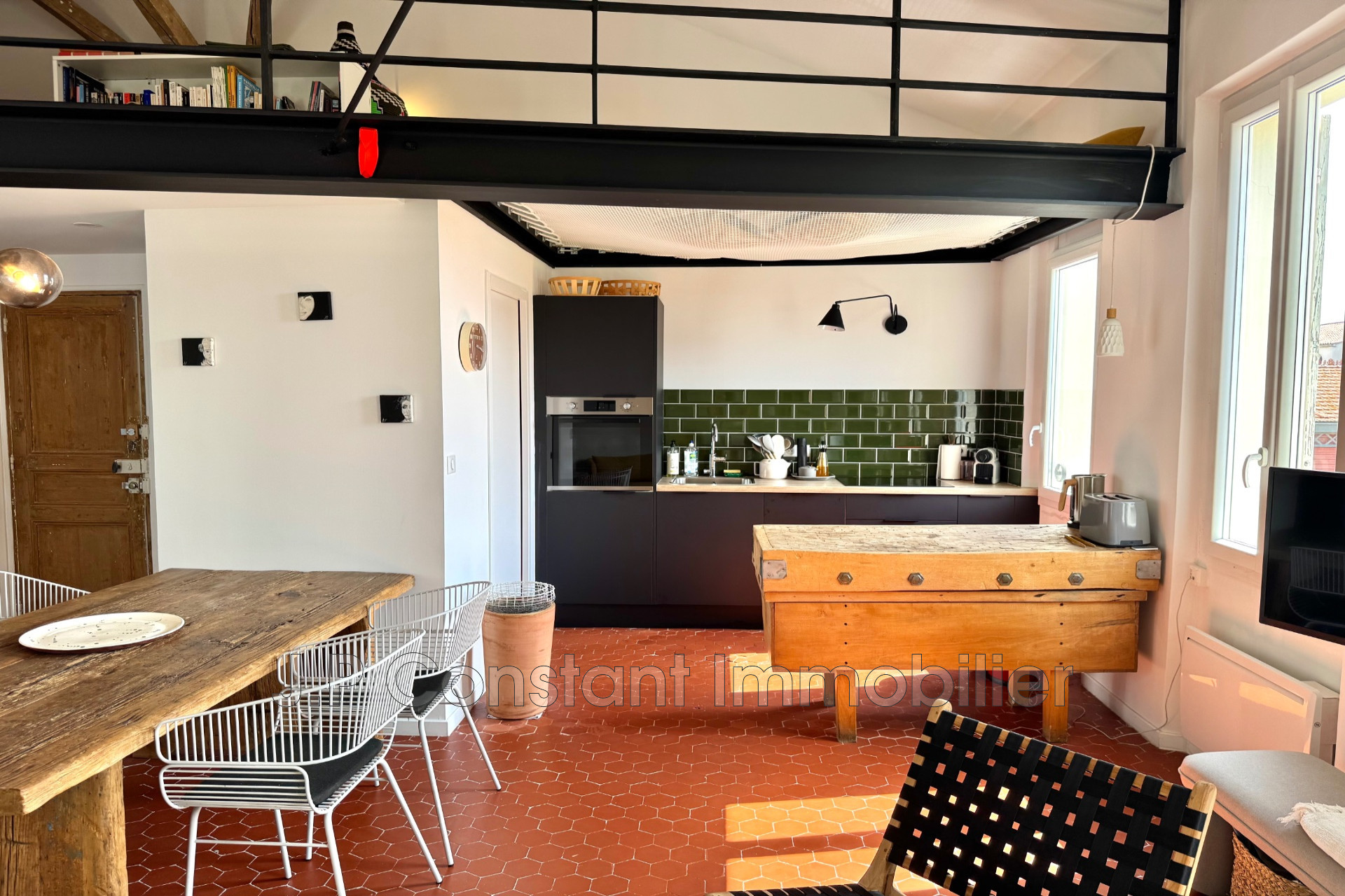 Dès le hall d'entrée, vous trouverez des tomettes en parfait état, un vaste espace de vie très lumineux avec séjour, salle à manger et cuisine en openspace. De la pièce de vie, vue sur les chantiers, les trois secs et le célèbre cinéma des frères Lumière.
