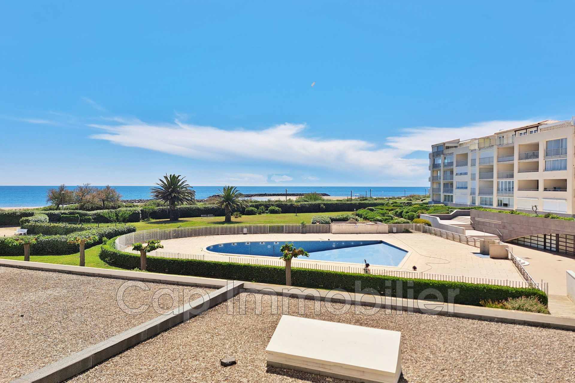 Immobilier achat vente Le Cap d'Agde - Quartier Rochelongue, ''Les Rivages de Rochelongue'', résidence sécurisée en première ligne sur la mer, avec piscine, boulodrome et local à vélos.