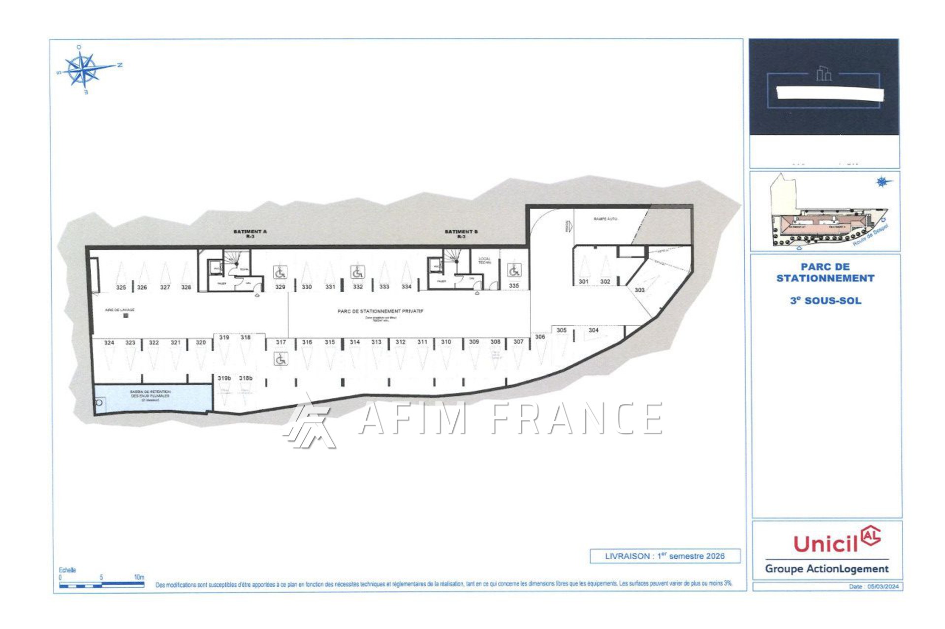 Menton sortie autoroute, dans un immeuble neuf en construction (livraison 1er semestre 2026) plateau de parkings, étage entier et privatif a la vente, surface de 1065 m² soit 37 places de stationnements. arrivée eau et électricité pour car wash.