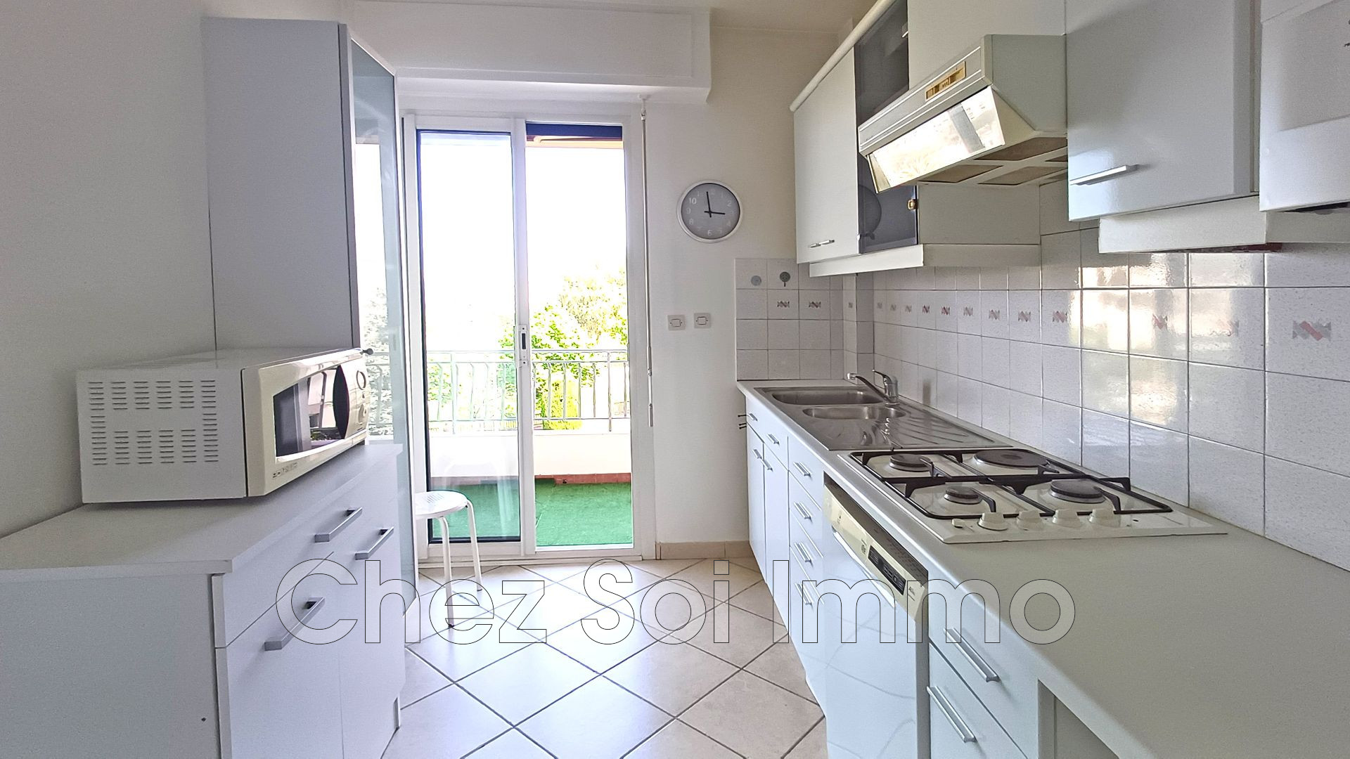 La grande terrasse est accessible par le séjour, la cuisine et la chambre.