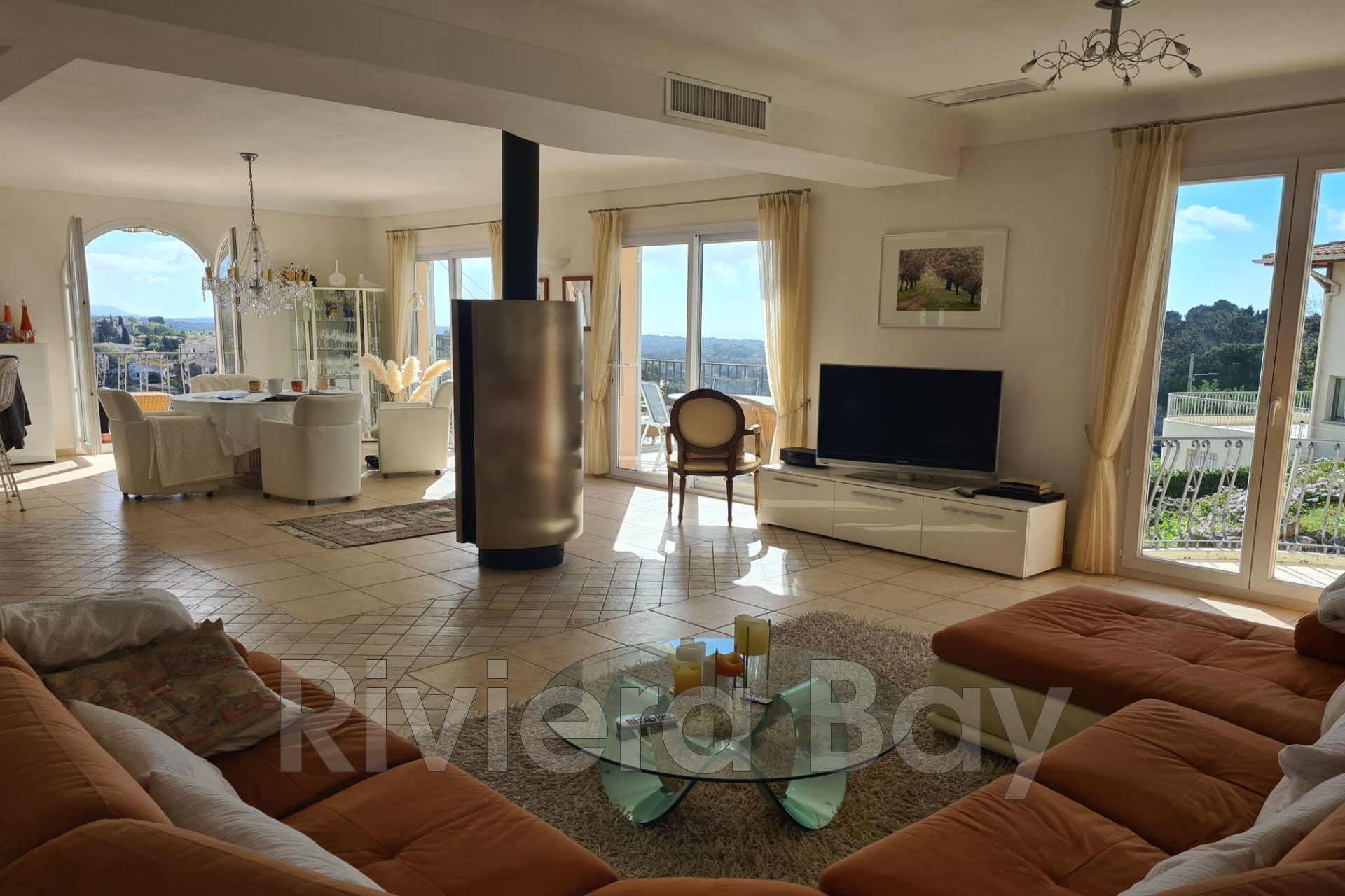 Spacieuse pièce à vivre de 56m² avec climatisation encastrée, superbe poêle à bois moderne, ouverte sur une large terrasse profonde avec magnifique vue mer et accès à la piscine, traitée au sel. Cuisine entièrement équipée. Toilettes d'invités avec douche.