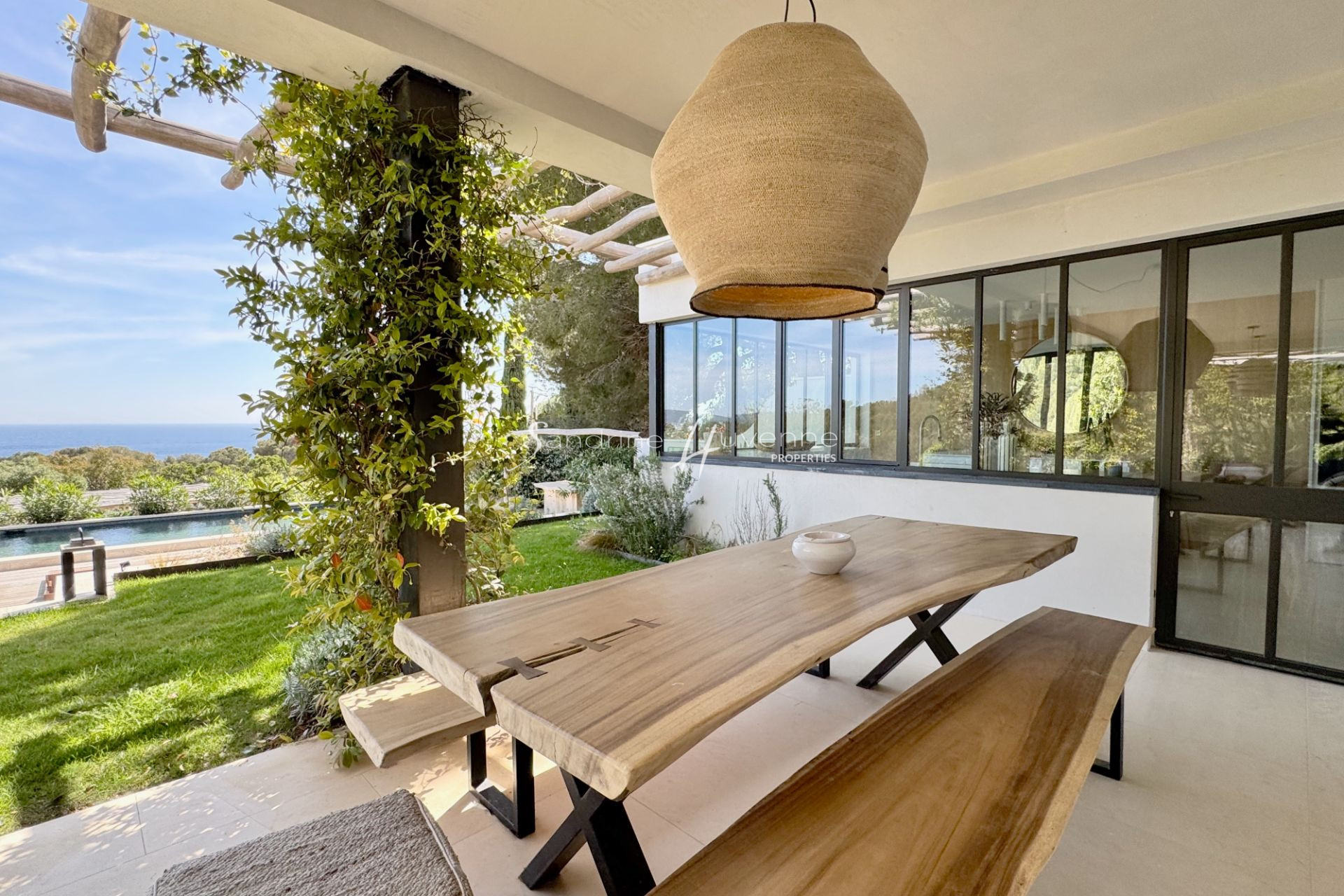 De plain-pied, le vaste salon de 65m2 avec superbe vue mer donne directement sur la terrasse couverte et la belle pelouse, et l'acce?s a? la piscine de 4,5mx15m. L'espace cuisine/repas pleinement ame?nage?e offre un acce?s imme?diat sur la terrasse couverte et fleurie, avec une vue mer toujours aussi exceptionnelle !