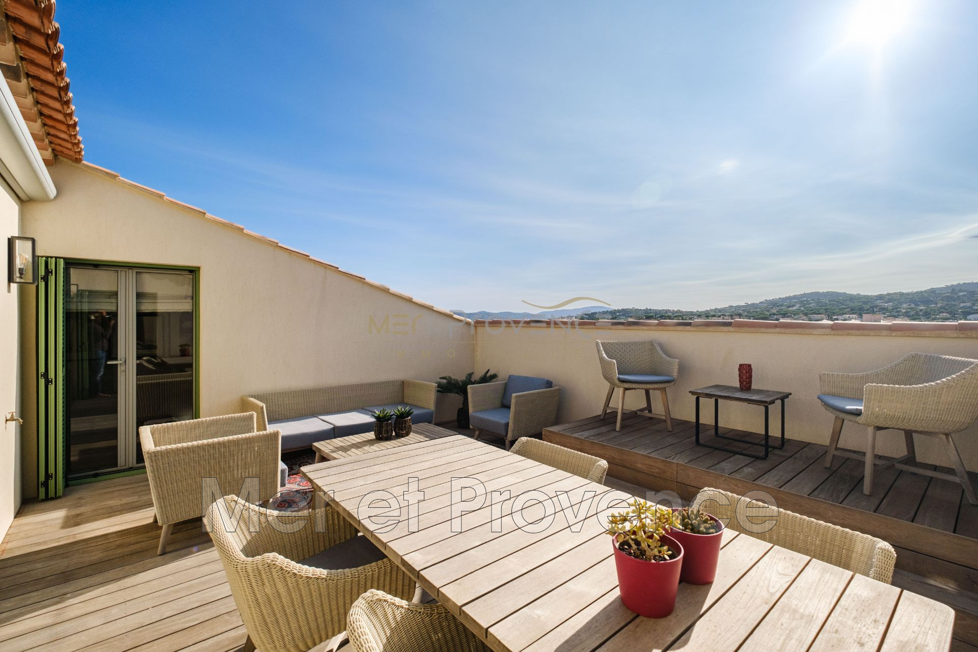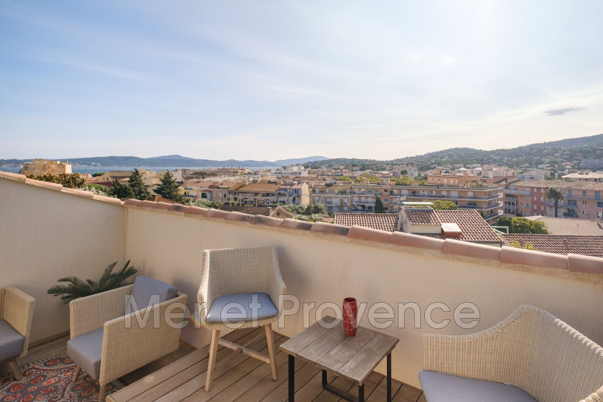 La pièce de vie s'articule autour d'une terrasse Tropézienne de 26 m² bénéficiant d'une exposition Sud-Ouest et d'une vue dominante sur le centre-ville et le golfe de Saint-Tropez.