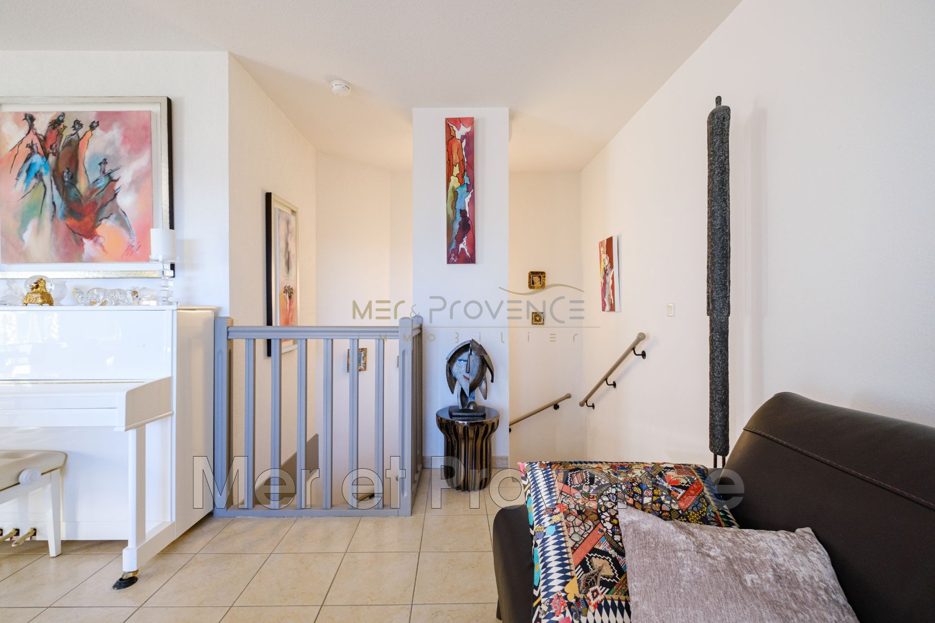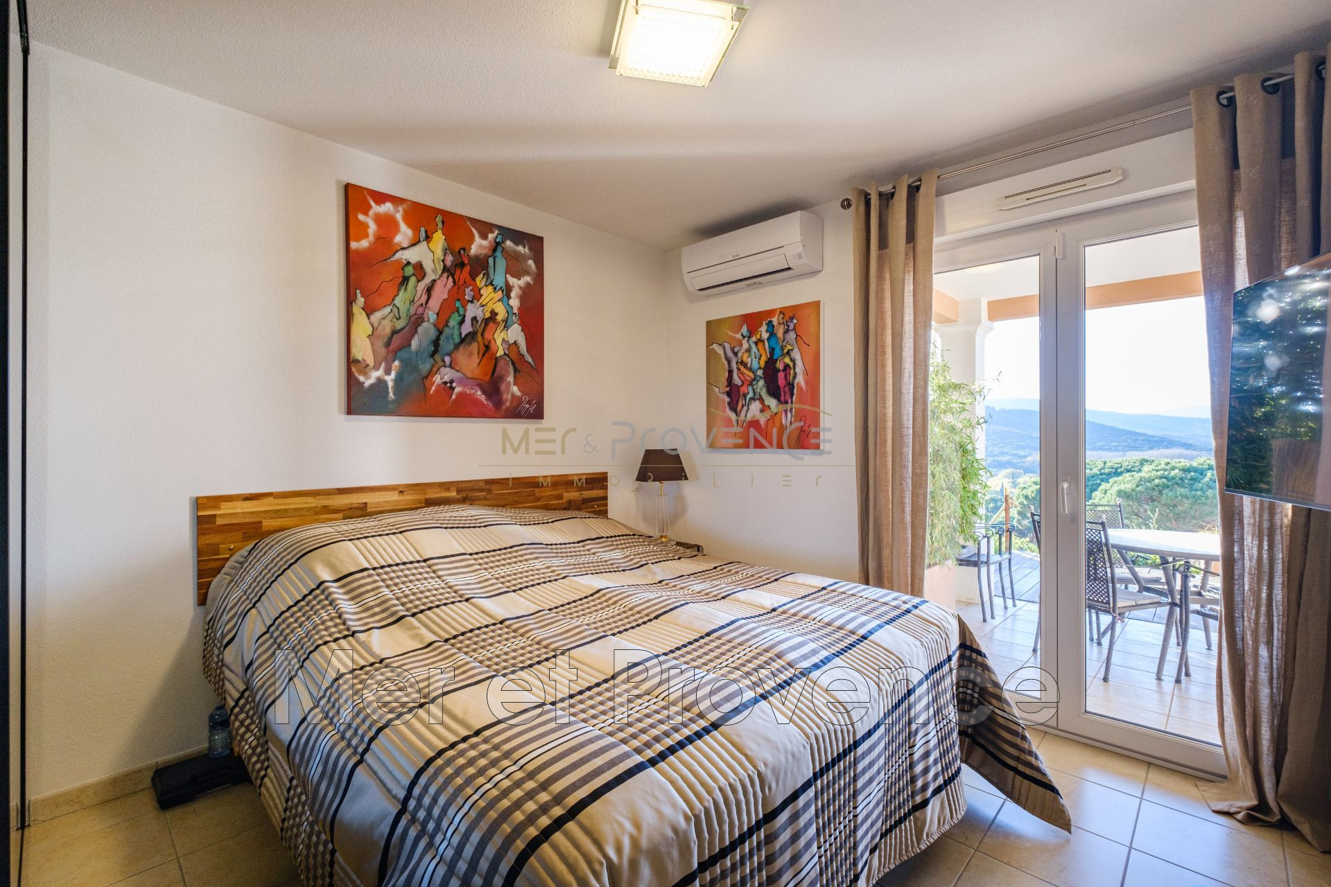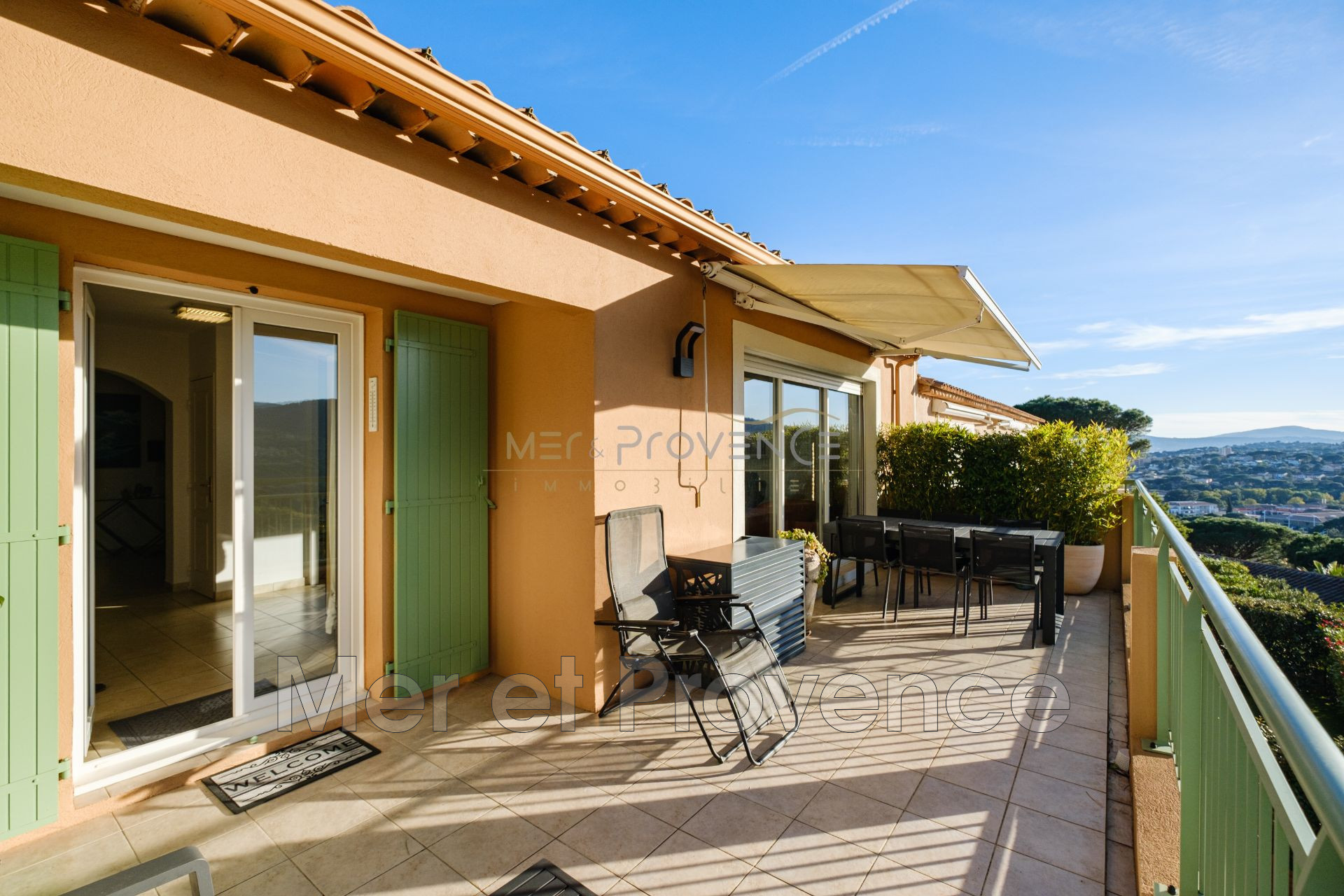 Le séjour est baigné de soleil toute l'après midi, il s'ouvre sur une terrasse abritée par un store banne électrique. La vue est dominante et sans le moindre vis à vis.
