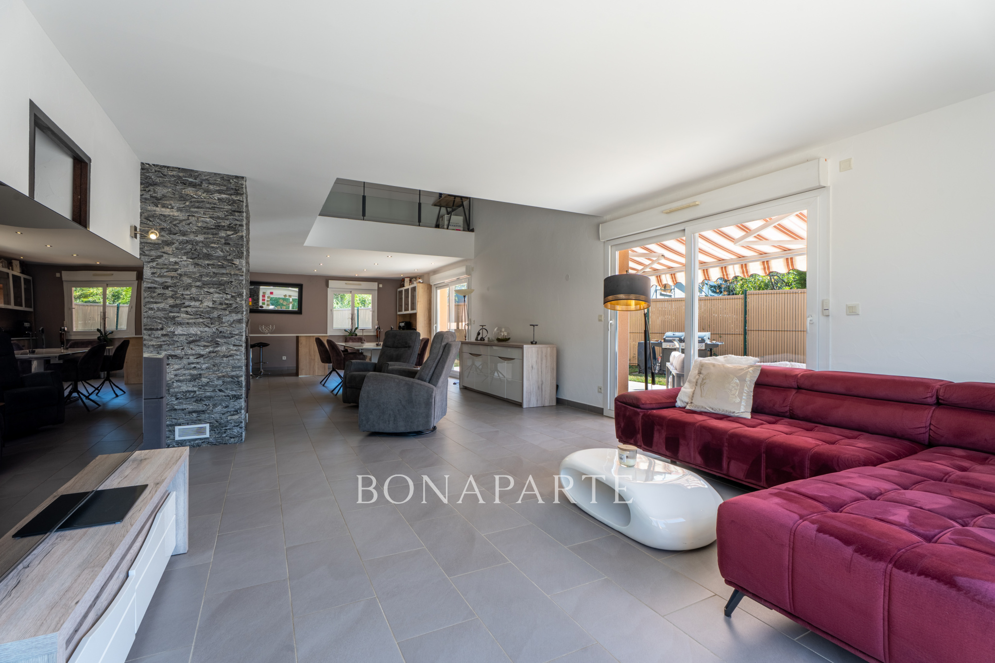 À seulement 7 minutes de la douane de Bardonnex et 20 minutes du centre de Genève, cette villa contemporaine de 2007 de 353 m2 habitables (386 m2 utiles) s'implante sur un terrain arboré et clos de 1028 m2 avec piscine et jacuzzi. Située en bout d'impasse dans un environnement résidentiel calme et recherché, elle séduit par ses volumes, sa luminosité et ses prestations haut de gamme.