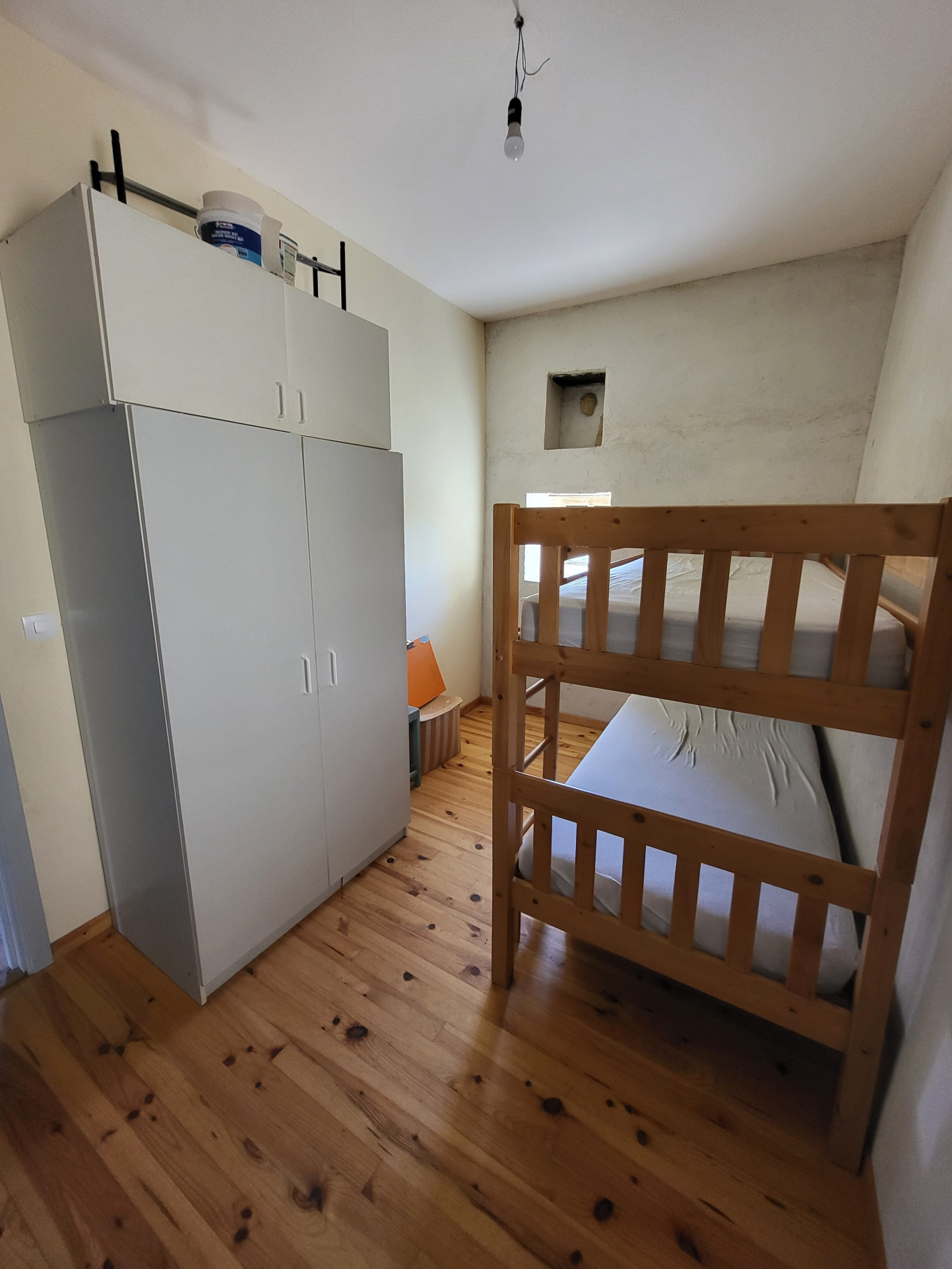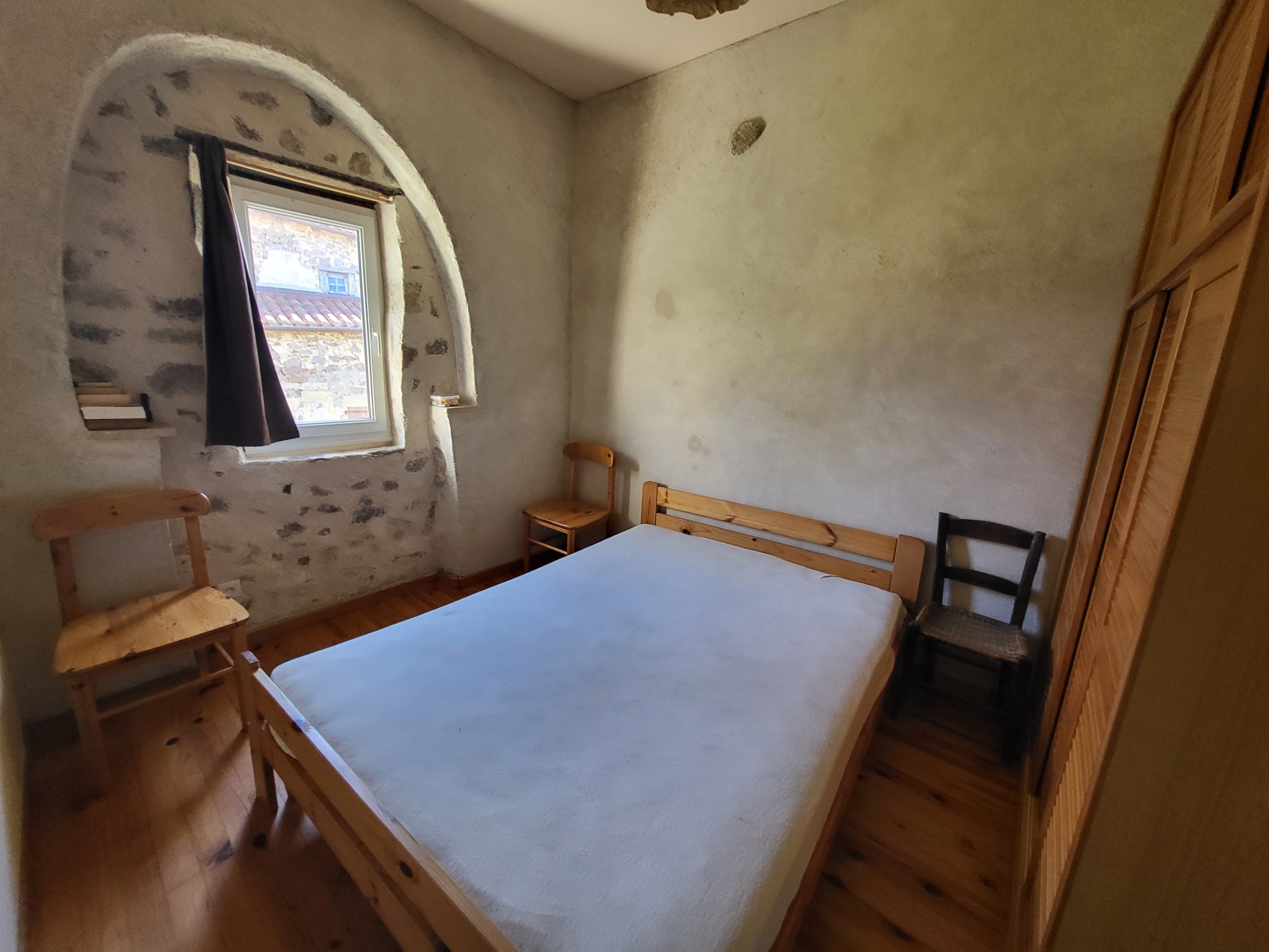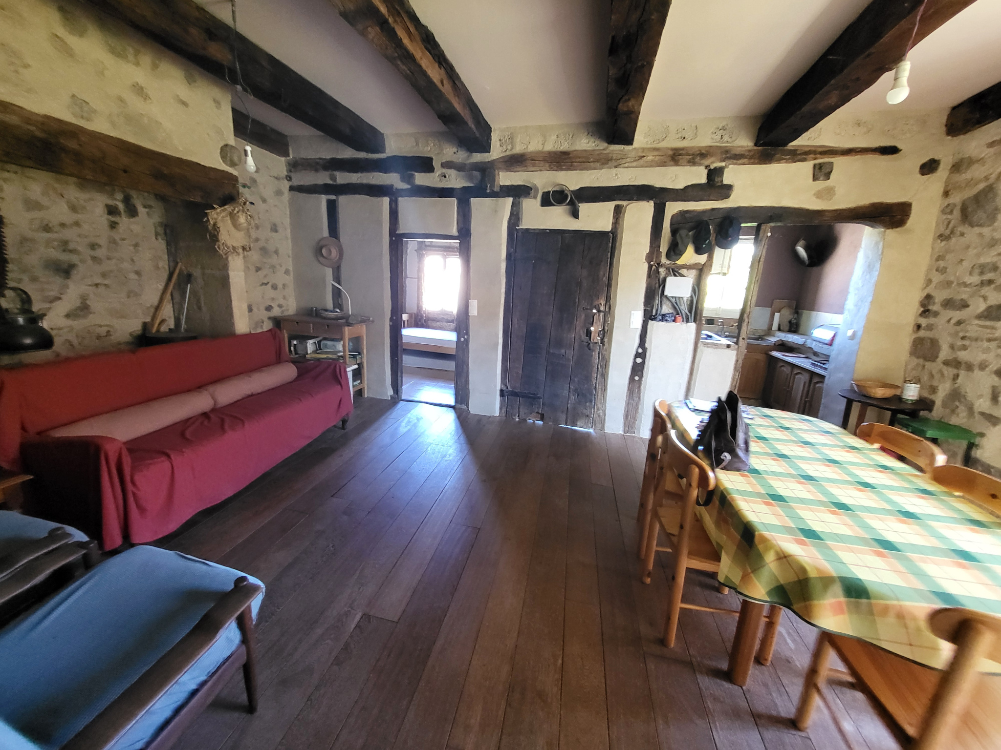 Séjour avec cantou équipée d'un poele à bois, petit coin cuisine, deux chambres, un bureau et une salle d'eau.