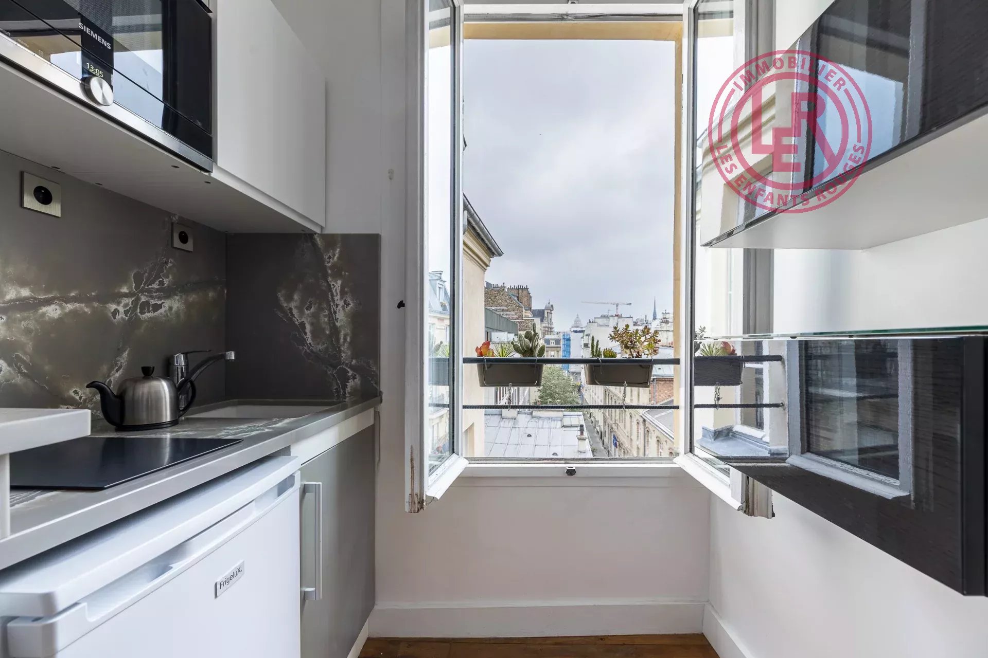 Exclusivité - Situé au 5ème et dernier étage d'un bel immeuble pierre de taille, ce studio traversant de 20m2 pondérés (17m2 loi Carrez, 23m2 habitables), se compose d'une pièce de vie, un coin cuisine, une salle de douche avec toilettes. Prestations coup de coeur : double exposition, luminosité, calme, vue exceptionnelle, Hauteur sous plafond 2,63m, rénovation haut de gamme (parquet chêne massif, plan de travail en marbre, mobilier sur mesure, volets intérieurs en bois, interrupteurs en acier brossé), nombreux rangements. La copropriété vient d'être entièrement ravalée (3 façades et toiture) DPE E Les informations sur les risques auxquels ce bien est exposé sont disponibles sur le site Géorisques : www.georisques.gouv.fr