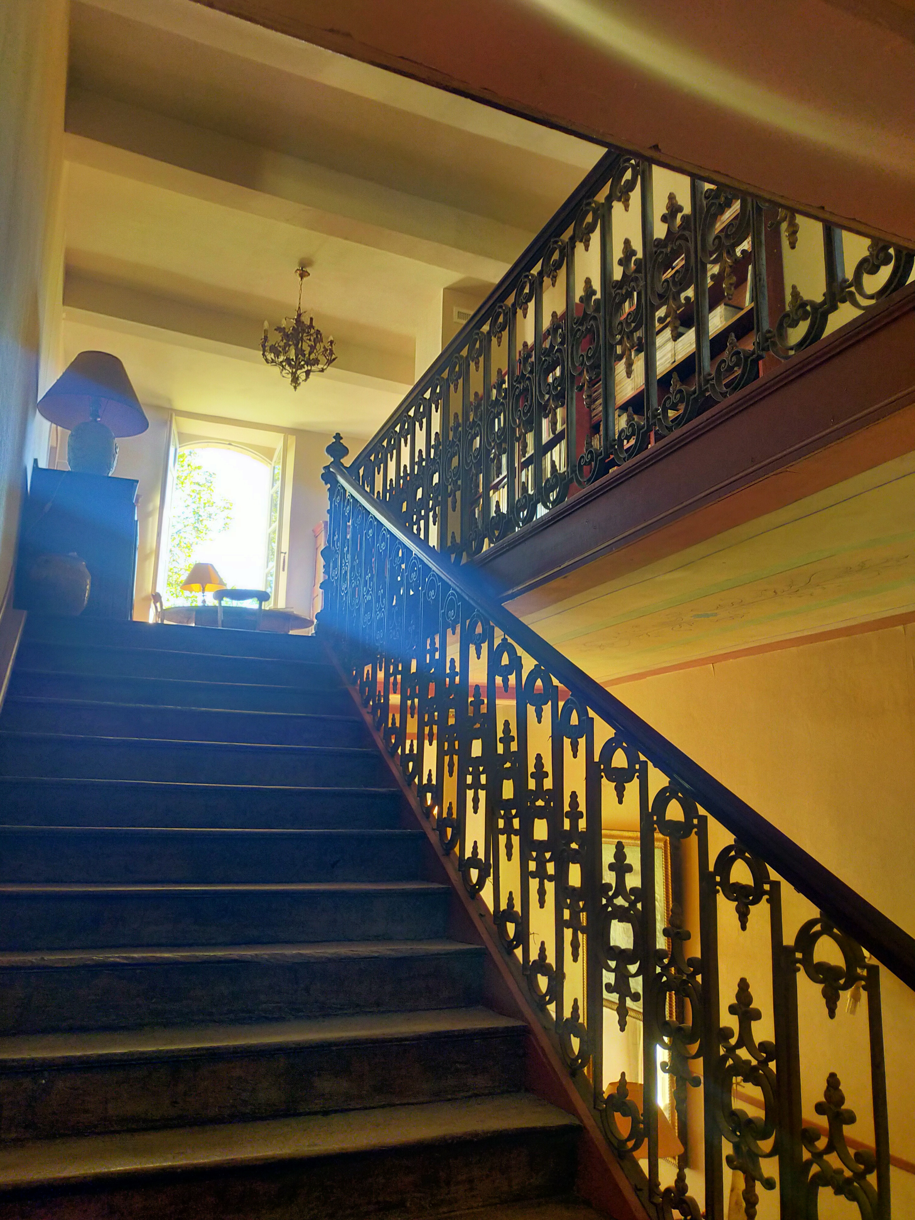 par un bel escalier en bois , des pierres et tomettes au sol , les peintures raffinés au plafond et les stuc sculptés des cheminées.