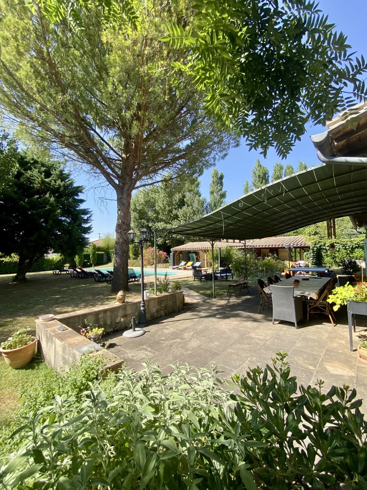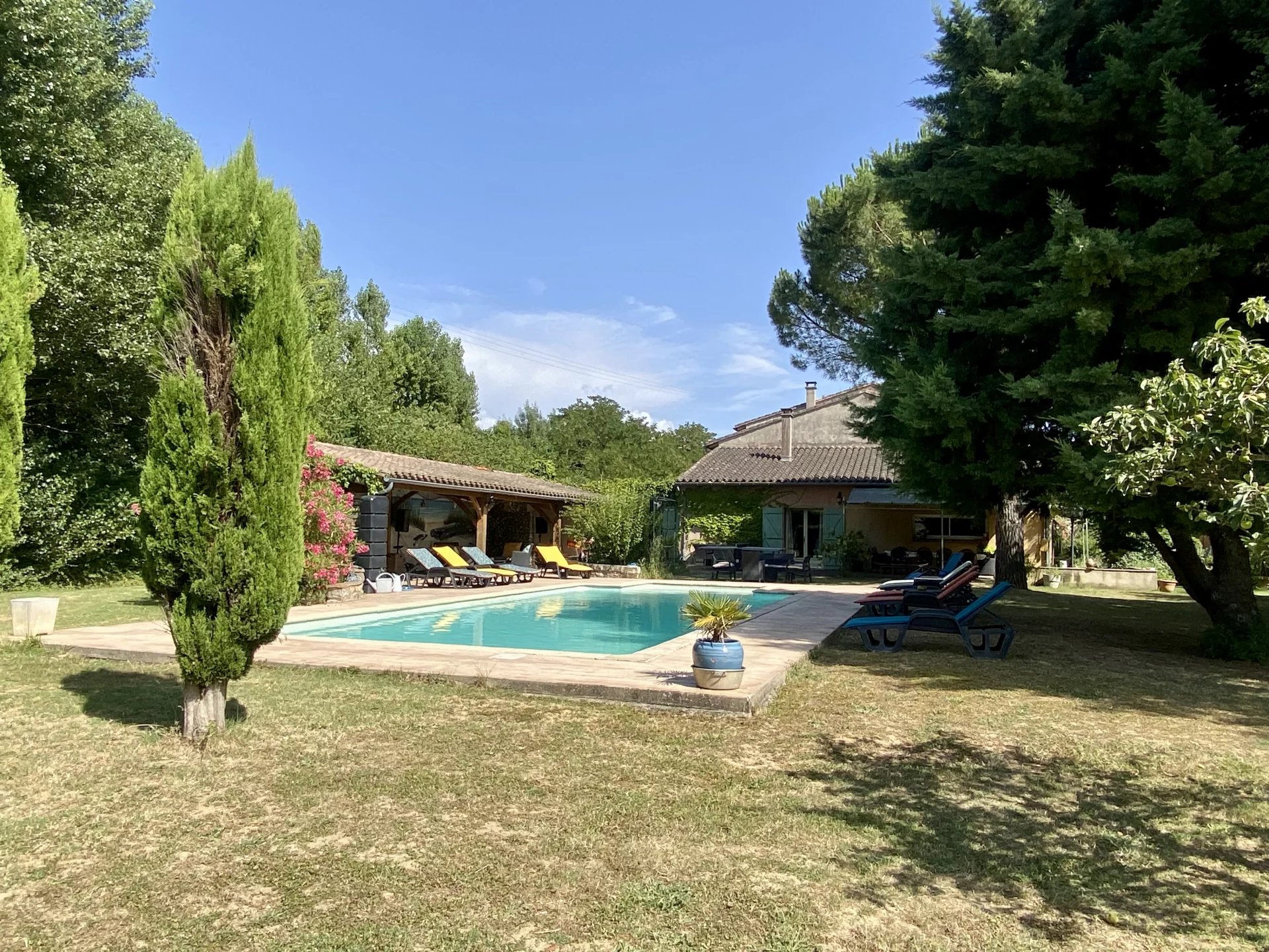 L'ensemble est implanté au coeur d'une parcelle arborée et entièrement clôturée de 6200 m2, avec espace piscine (bassin 5m x 10m) et terrasse couverte de 40 m2, pour d'agréables moments de détente.