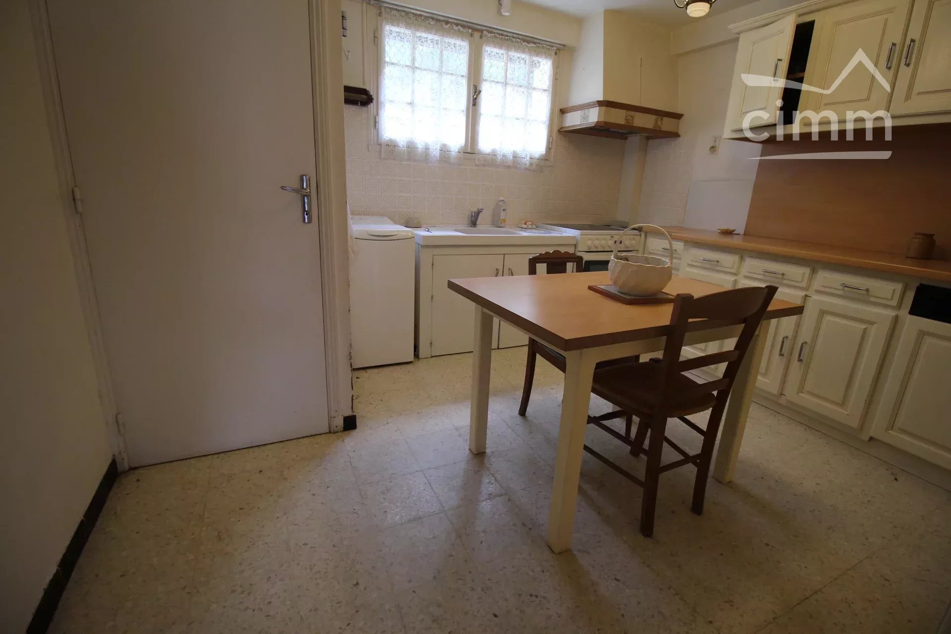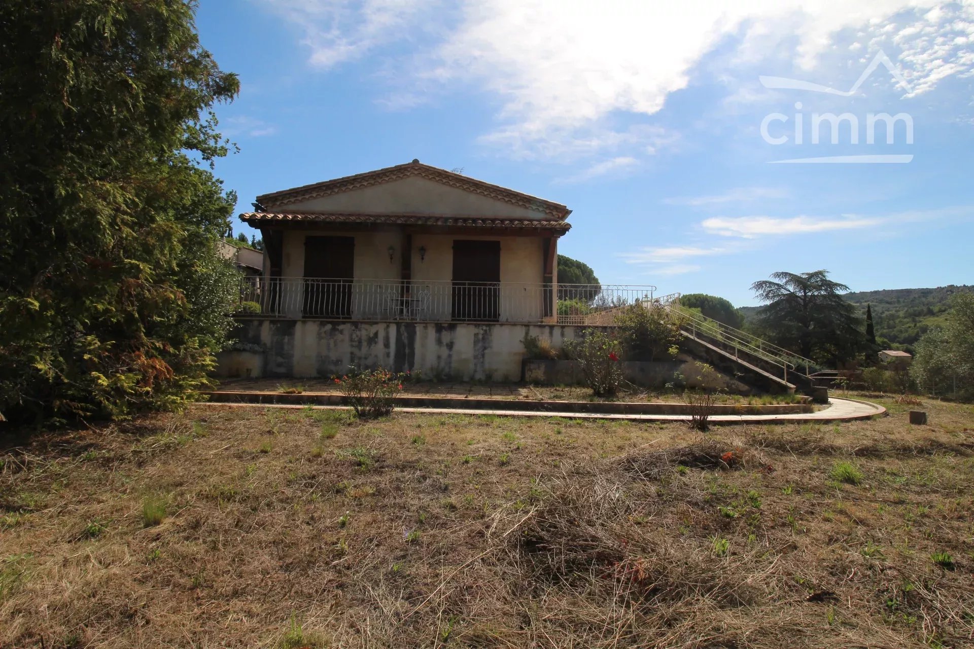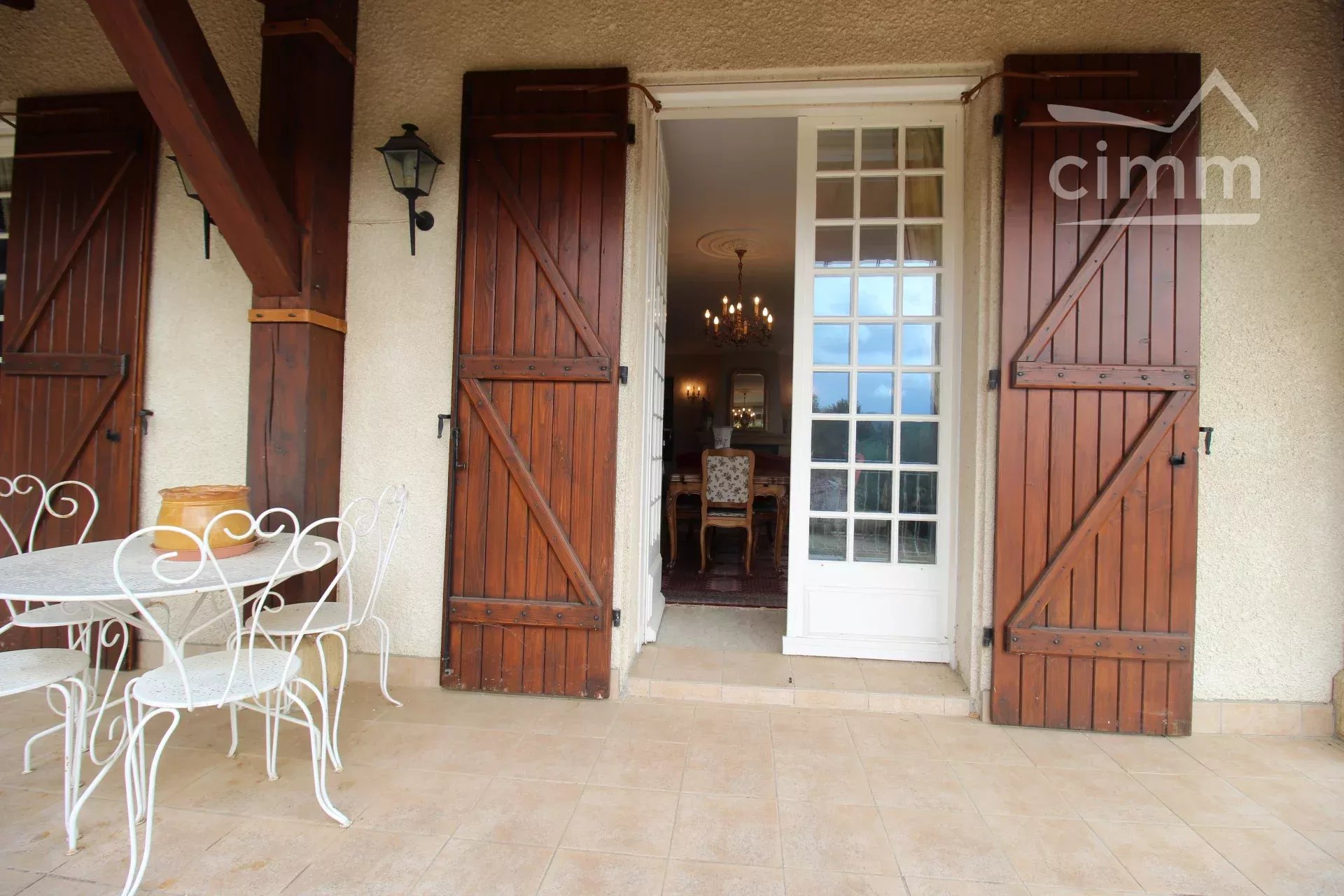 L'accès à l'habitation principale se fait par quelques marches extérieures. La maison se compose d'une cuisine de 12m² donnant sur la terrasse, d'un grand salon salle à manger de 42m² donnant également sur la terrasse de 70 m².