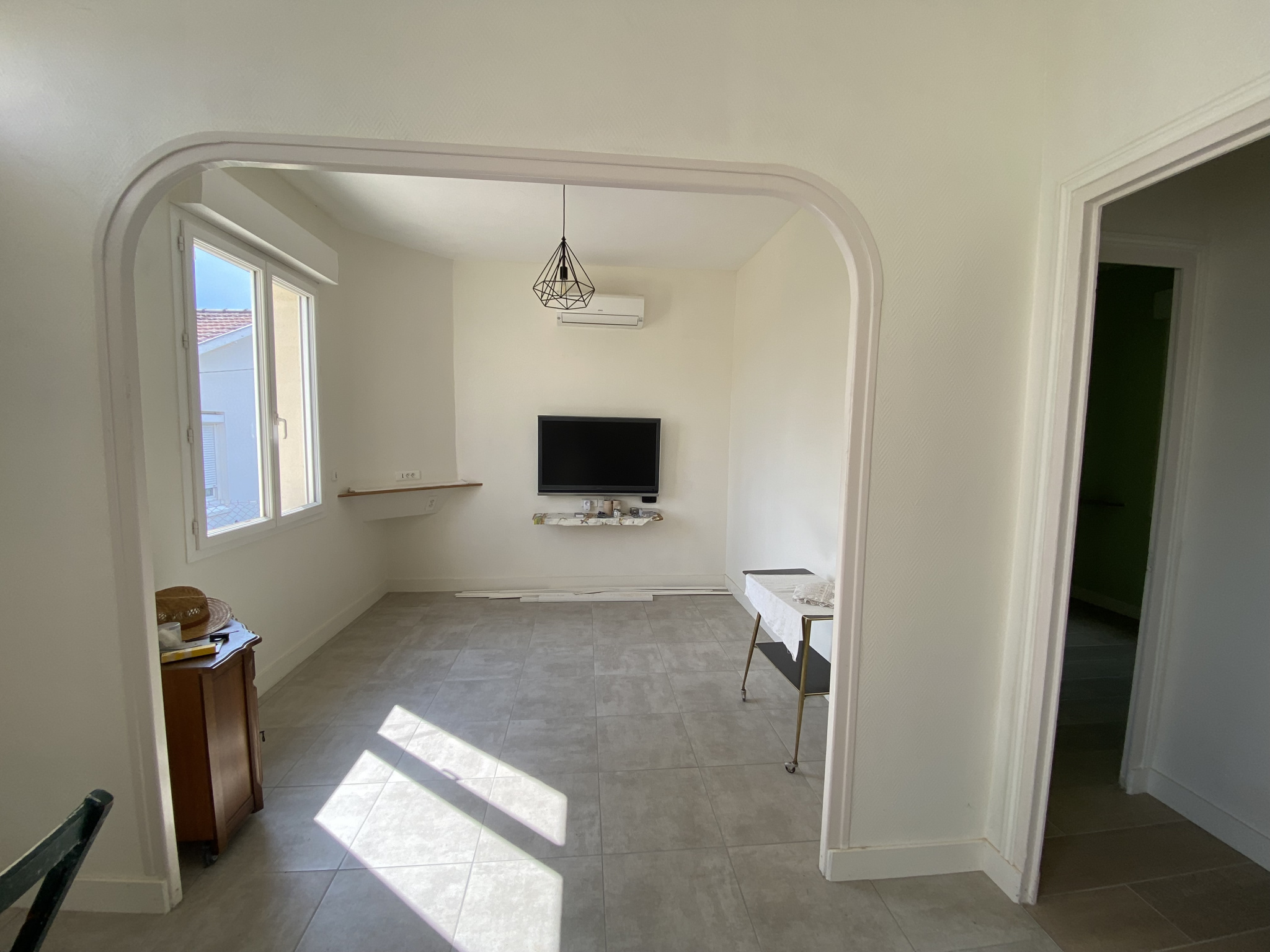 La maison de plain-pied, entièrement rénovée, comprend une entrée, un salon-séjour, une cuisine meublée, un cellier, deux chambres, une salle d'eau et un wc.