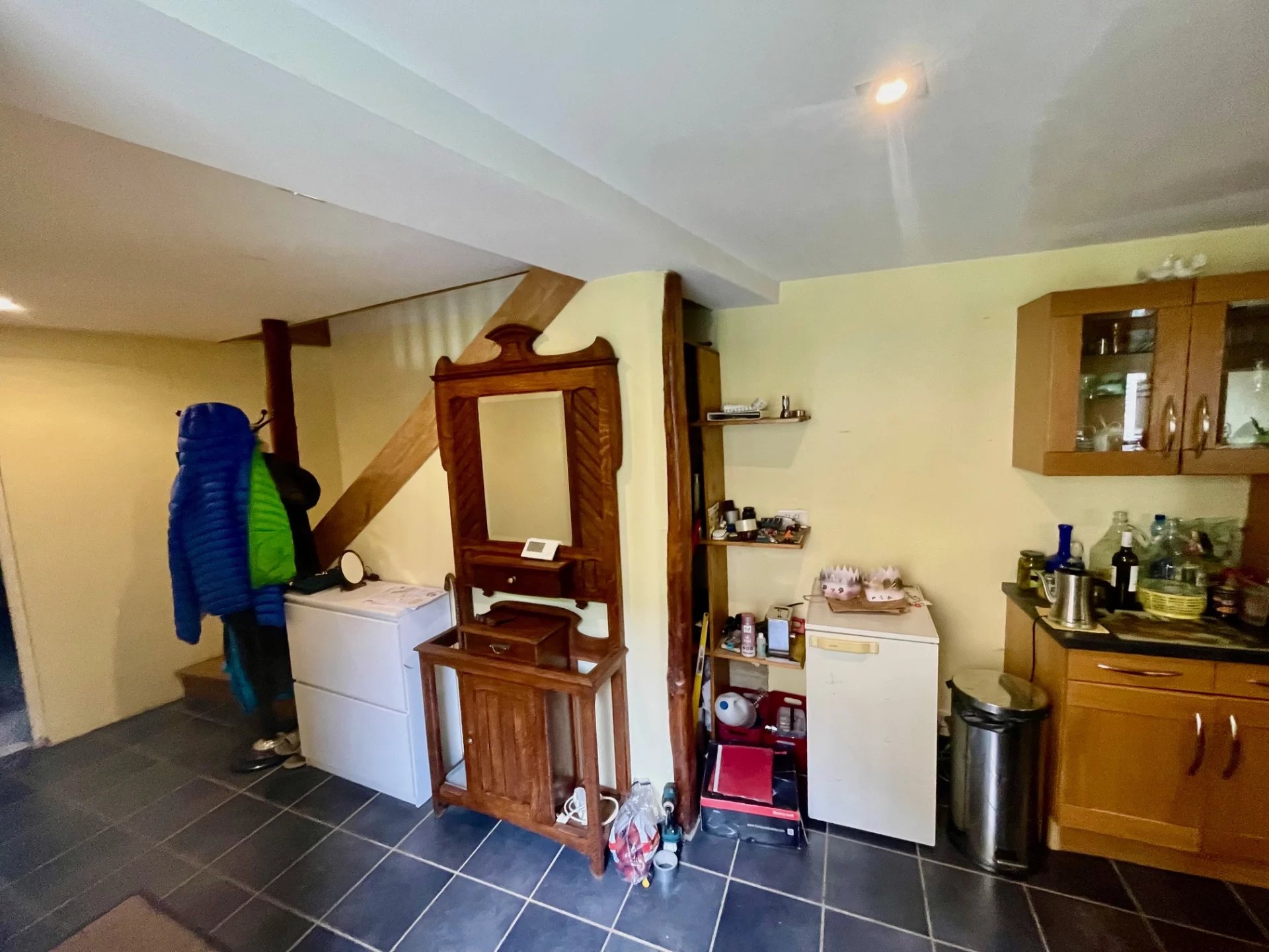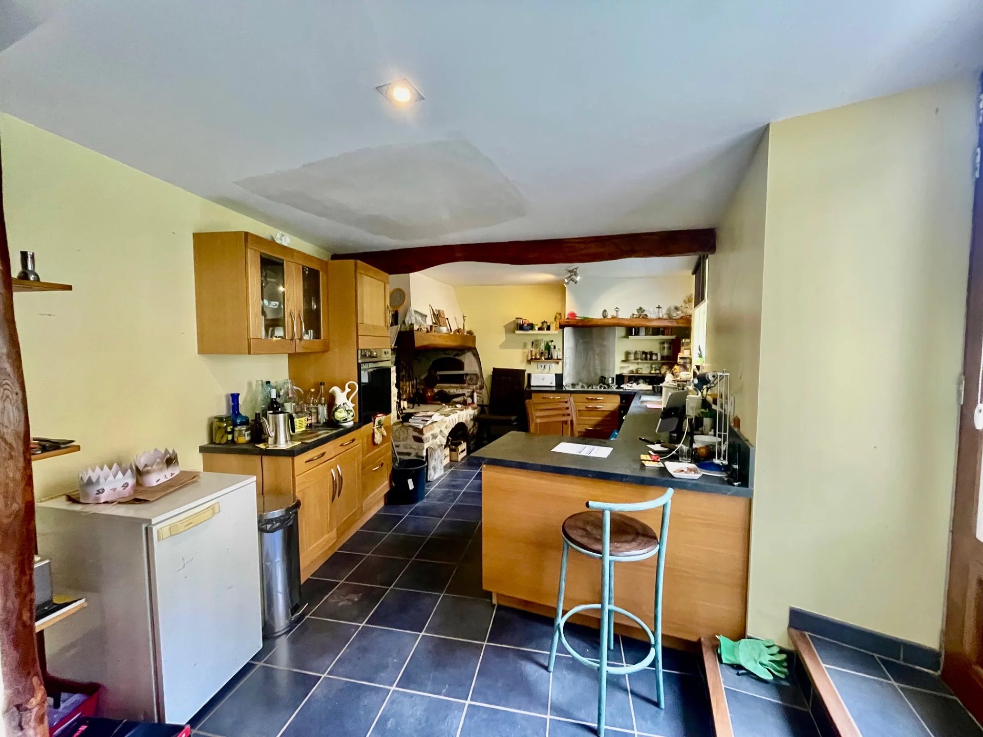 Elle dispose en rez-de chaussée, d'une cuisine équipée avec cheminée ouverte et four à pain, d'une belle pièce de vie très lumineuse et d'une salle d'eau avec WC.