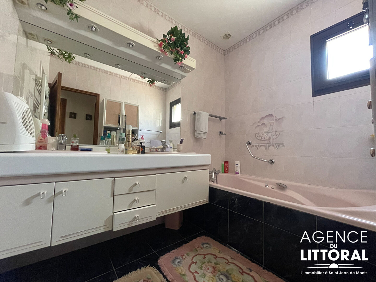 L'Agence du Littoral vous présente : A seulement 1.2 km de la plage des demoiselles, une maison de plain-pied composée d'une magnifique et lumineuse pièce de vie donnant sur la terrasse, une véranda, une cuisine aménagée et équipée, une arrière cuisine, une chambre avec salle d'eau, un dégagement, deux chambres avec placard, une salle de bains et deux wc indépendant. Le tout sur un terrain clos de 598 m² sans vis à vis avec un garage avec un point d'eau, un appentis, et une cabanon en bois. Situation : Piste cyclable, proche forêt, proche des plages. Coup de coeur !! réf 400 Agence du Littoral - Agence du Littoral - Agence immobilière à votre service sur le secteur de Saint-Jean-de-Monts et ses alentours. Contactez nous au 02.51.59.17.70. (5.00 % honoraires TTC à la charge de l'acquéreur.)